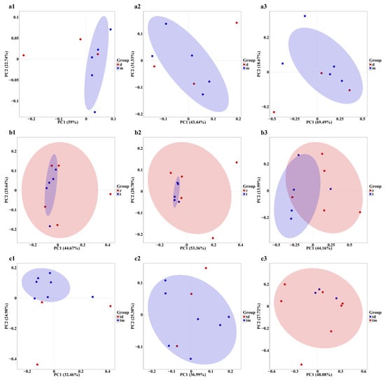 PCoA of community composition across the three study areas. (a1–a3): Tianjin Dashentang Marine Ranching: (a1) phytoplankton, (a2) invertebrates, (a3) fish; (b1–b3) Tianjin Binhai National Marine Park: (b1) phytoplankton, (b2) invertebrates, (b3) fish; (c1–c3) Western Furong Island Marine Ranching Area: (c1) phytoplankton, (c2) invertebrates, (c3) fish. “d” represents the control area; “m” represents the ranching zone; “r” represents the artificial oyster reef area; “t” represents the natural oyster reef area; “tm” represents the ranching zone; “td” represents the control area. The colored areas represent 95% confidence ellipses for different groups.