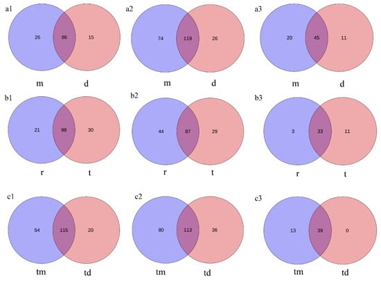 Venn diagram of species overlap across the three study areas. (a1–a3) Tianjin Dashentang Marine Ranching: (a1) phytoplankton, (a2) invertebrates, (a3) fish; (b1–b3) Tianjin Binhai National Marine Park: (b1) phytoplankton, (b2) invertebrates, (b3) fish; (c1–c3) Western Furong Island Marine Ranching Area: (c1) phytoplankton, (c2) invertebrates, (c3) fish. “d” represents the control area; “m” represents the ranching zone; “r” represents the artificial oyster reef area; “t” represents the natural oyster reef area; “tm” represents the ranching zone; “td” represents the control area.