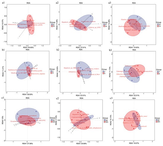 RDA of community composition across the three study areas. (a1–a3) Tianjin Dashentang Marine Ranching: (a1) phytoplankton, (a2) invertebrates, (a3) fish; (b1–b3) Tianjin Binhai National Marine Park: (b1) phytoplankton, (b2) invertebrates, (b3) fish; (c1–c3) Western Furong Island Marine Ranching Area: (c1) phytoplankton, (c2) invertebrates, (c3) fish. “d” represents the control area; “m” represents the ranching zone; “r” represents the artificial oyster reef area; “t” represents the natural oyster reef area; “tm” represents the ranching zone; “td” represents the control area. Arrows indicate environmental vectors, including salinity (S), conductivity (Q), temperature (T), and pH; the direction and length of each arrow reflect the strength and direction of correlations with community composition. Red five-pointed stars represent key species showing the strongest responses to environmental gradients in the RDA analysis. Colored areas denote the 95% confidence ellipses for different groups.