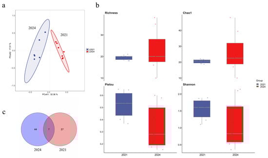 Comparison of fish community structure between 2021 and 2024 in the Western Furong Island Marine Ranching Area. (a): PCoA of community composition; The colored areas represent the 95% confidence ellipses for different groups. (b): Alpha diversity indices; The dots represent the values of the alpha diversity indices for individual samples. (c): Venn diagram showing shared and unique species.