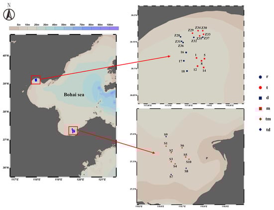 Sampling Station Distribution Map. r: Artificial oyster reef area (Tianjin Binhai National Marine Park); t: Natural oyster reef area (Tianjin Binhai National Marine Park); m: Ranching zone (Tianjin Dashentang Marine Ranching); d: Control area (Tianjin Dashentang Marine Ranching); tm: Ranching zone (Western Furong Island Marine Ranching Area); td: Control area (Western Furong Island Marine Ranching Area).