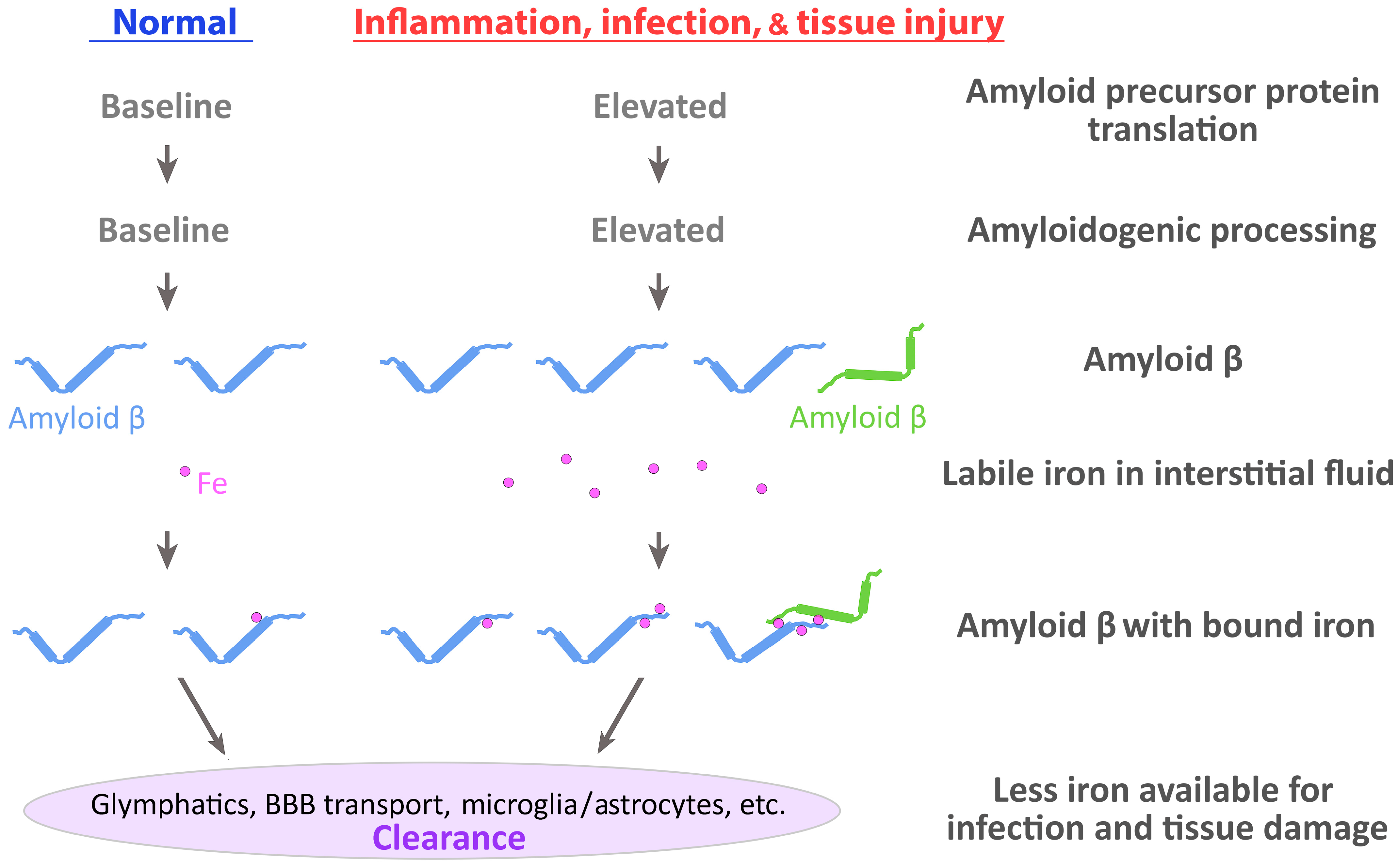 | Amyloid β expression can increase during infection, inflammation, or high iron levels | This response can reduce the availability of labile iron during times of need, i.e., when it would be helpful to have less available iron |