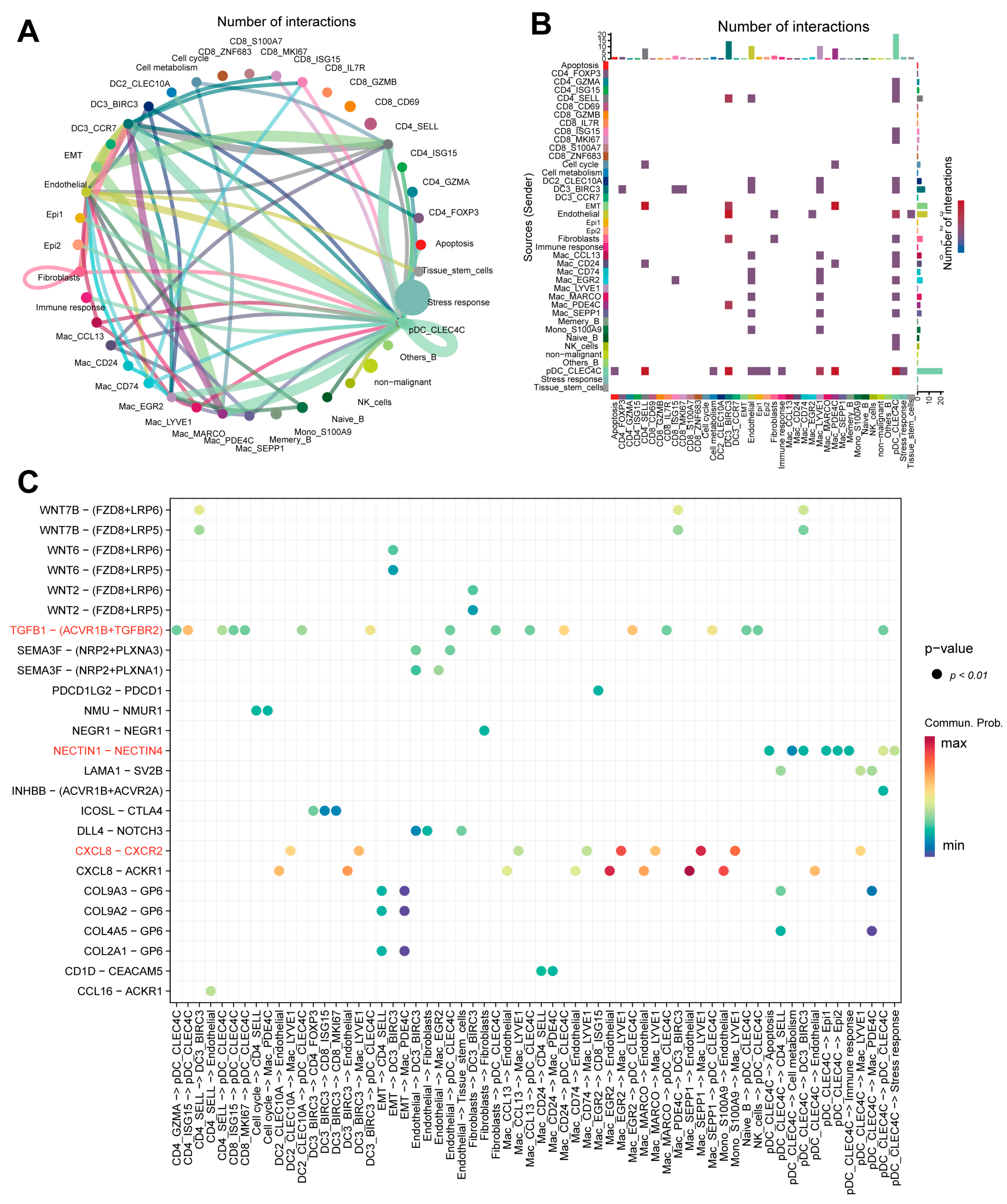 2.4. The Interaction of pDC_CLEC4C with Stress Response and Immune Response Tumor Subpopulations Is Implicated in Immune Evasion