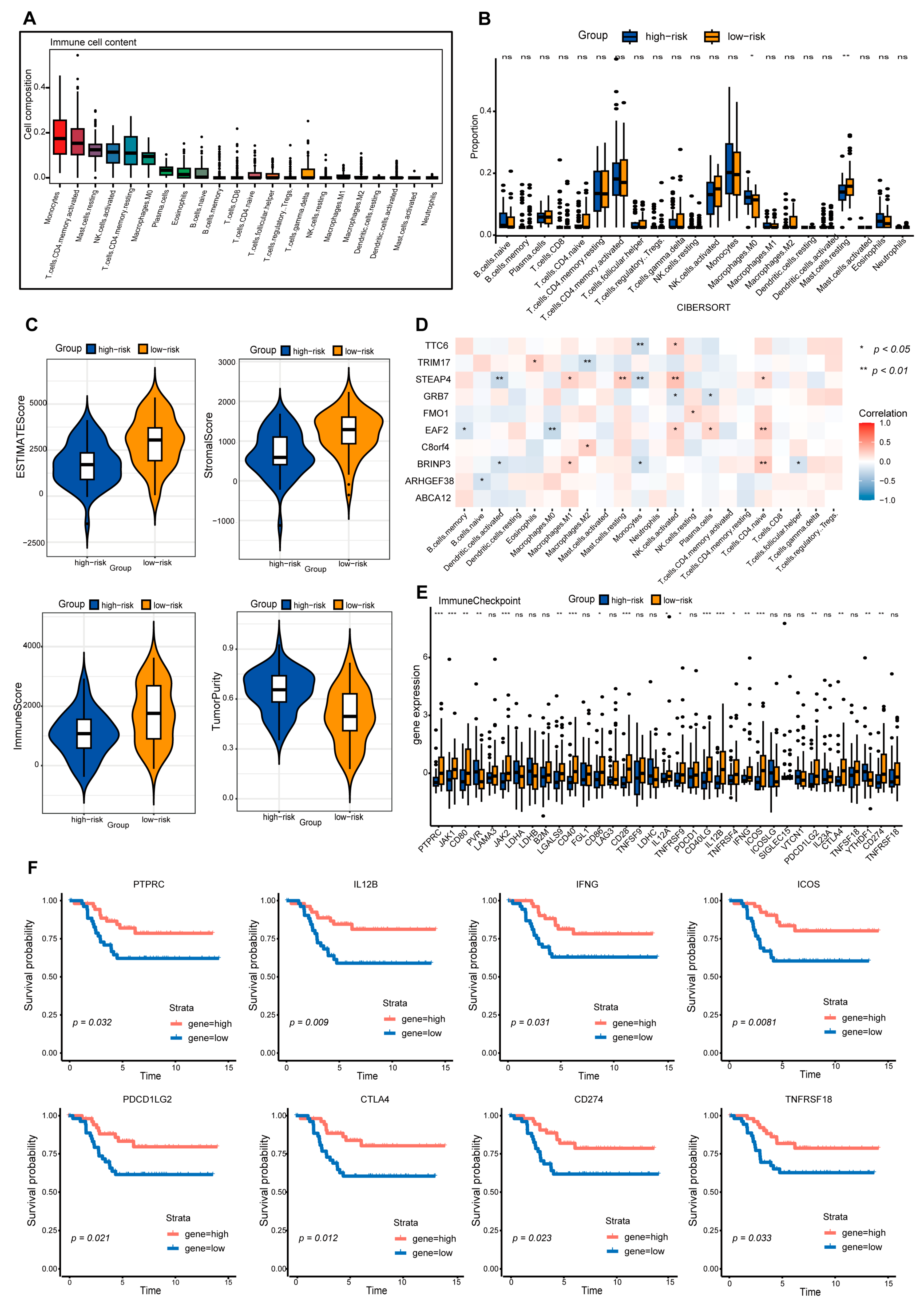 2.6. The Low-Risk Group Is Characterized by High Infiltration of Multiple Immune Cell Types and Elevated Expression of Immune Checkpoints