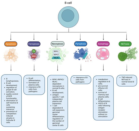 The crosstalk between different cellular lethal subroutines is well-documented. Particularly, pyroptosis, apoptosis and necroptosis pathways are tightly interconnected, which resulted in the description of a unique and separated RCD termed “PANoptosis”. PANoptosis shares features of all the above-mentioned cell death pathways and is regulated by structurally variable PANoptosome complexes composed of sensor proteins, adaptor proteins, and effector proteins with catalytic activity [166,167]. PANoptosis is a pro-inflammatory RCD and is considered separately in a more holistic way than just the interplay and coordination between three individual RCDs. Unfortunately, there are no data available in the literature that would evaluate PANoptosis or describe whether PANoptosis even occurs in normal B cells, but this RCD is documented for hematological malignancies [168].