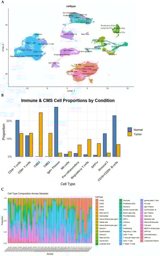 (A) UMAP visualization of the integrated dataset, annotated into epithelial, stromal, immune, and specialized cell populations based on canonical marker genes. Subpopulations include CD4+ and CD8+ T cells, Tregs, Th17, Tfh, B cells, IgA+/IgG+ plasma cells, dendritic cells, NK cells, mast cells, multiple stromal lineages, and epithelial cell states including CMS1–CMS4, goblet cells, tuft cells, and BEST4+ enterocytes. (B) Total pro-portions of major cell classes in normal versus cancer samples, highlighting expansion of CMS2/3 tumor epithelial cells, pro-inflammatory macrophages, NK cells, Tregs, and SPP1+ macrophages in tumors. (C) Distribution of the eleven most abundant cell types in cancer and normal tissues, illustrating shifts in epithelial, immune, and stromal populations.