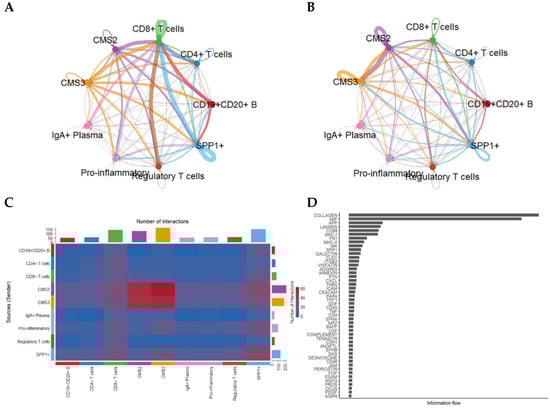 Intercellular communication patterns stratified by CMS2 and CMS3 tumor epithelial subtypes. (A) Network visualization showing the number of predicted interactions between CMS2/CMS3 epithelial cells and immune/stromal subsets. (B) Corresponding network based on total communication strength (information flow). (C) Heatmap showing pairwise interaction counts across epithelial and immune populations. (D) Ranking of signaling pathways based on total information flow, illustrating predominant pathways enriched in CMS2/CMS3-mediated communication.