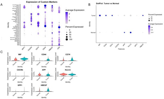 Expression of key ligand and receptor genes involved in predicted communication pathways. (A) Dot plot of mean expression and percentage of expressing cells across all cell types for SPP1, CXCR4, CD74, CD44, HBEGF, and CD9. (B,C) Comparison of expression levels of MIF, CD44, CD74, SPP1, CXCR4, APP, HLA-A, HBEGF, and CD9 between cancerous and normal tissues, revealing tumor-specific upregulation of immunoregulatory molecules and macrophage markers.