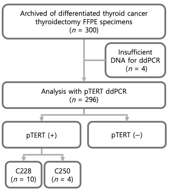 This retrospective study included archived formalin-fixed, paraffin-embedded (FFPE) thyroid cancer specimens and corresponding clinicopathological data from 300 patients with differentiated thyroid cancer (DTC) who had undergone thyroidectomy between March 2010 and July 2012. Samples with insufficient DNA for droplet digital PCR (ddPCR) analysis () were excluded; therefore, 296 cases were ultimately evaluated (Figure 1). Among these 296 cases, ddPCR identified 14 mutation-positive samples (C228T, ; C250T, ) and 282 mutation-negative samples.