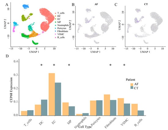 Single-cell type expression in left atrial tissue for CEP68. (A) A total of 9 cell types were identified. (B,C) Differences in CEP68 expression was observed across different cell types in both AF and control groups. Purple dots indicate higher CEP68 expression, whereas grey dots indicate low or undetected expression. (D) A comparison of CEP68 expression was made for each cell type between the AF and control groups. * indicates statistical significance between AF and control for the indicated cell type (p < 0.05). Abbreviations: AF, atrial fibrillation; CT, control; DC, dendritic cells; EC, endothelial cells; MP, macrophages; VSMC, vascular smooth muscle cells; UMAP, uniform manifold approximation and projection.