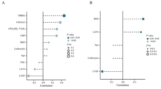 The correlation between potential target genes and clinical biomarkers—including C-reactive protein, NT-proBNP, CHA2DS2-VASc score, leukocyte count, age, LAVI, and LVEF—was assessed. In the 22 patients without AF from the PREDICT-AF study, three blood biomarkers associated with cardiac remodeling—Tenascin-C (TNC), Collagen VIII alpha 2 (COL8A2), and THBS2—were measured using ELISA [33]. Immunohistochemistry was performed to analyze interstitial collagen and vimentin-positive interstitial area in all 62 patients [34].
