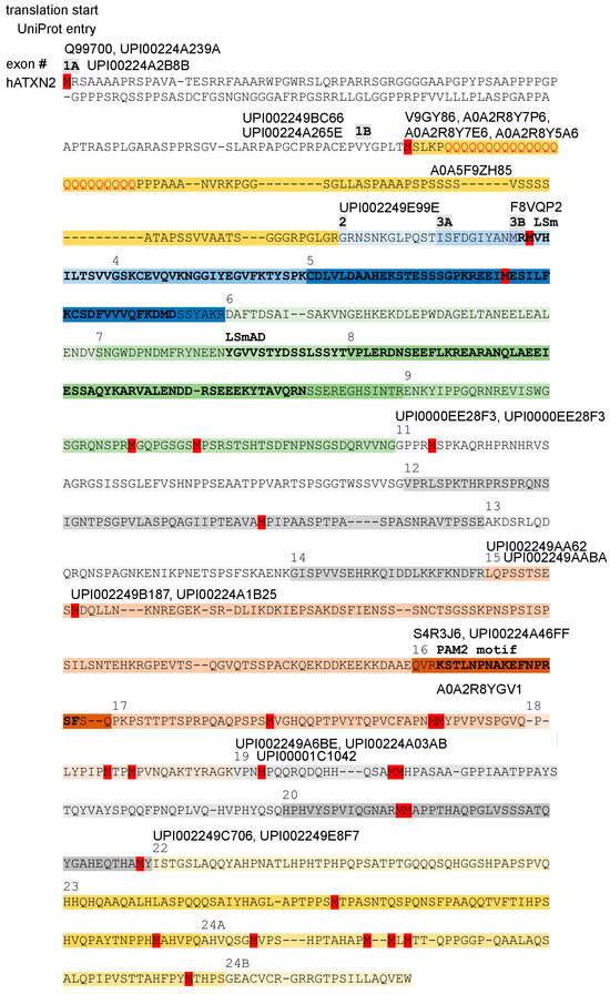 Multiple translation starts (methionine residues in red color), resulting in many long and short isoforms, are documented in protein databases. The scheme shows a version of human ATXN2 without the sequences encoded by alternatively spliced exons 10 and 21, corresponding to the alignment of human ATXN2 versus ATXN2L and murine ATXN2 versus ATXN2L in Supplementary Material S5. The coding of amino acids by individual exons is illustrated by different background color hues, with the exon number (#) indicated above the starting amino acid, highlighting the LSm and LSmAD domain as well as the PAM2 motif above the residues that stand out in bold letters. UniProt–UniParc database entry IDs are placed at different positions above the amino acid thread to indicate where each isoform of ATXN2 converges with the consensus sequence, while ignoring any isoform-specific start codon and downstream divergent amino acids that precede the constitutive ATXN2 fragments. The existence of multiple large and short isoforms of ATXN2 protein is supported by the analysis of mRNA isoforms (Figure S1) and by the molecular weight of bands detected in immunoblots by antibodies that target epitopes in the C-terminal half.