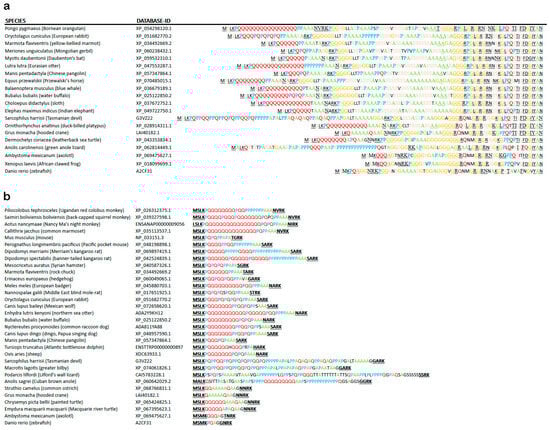 The second alternatively spliced exon in ATXN2 encodes the highly conserved translation start sequence MS(L/M)K(P)n(Q)n(P)n to produce an additional N-terminal fragment of up to 50–120 aa that contains several repeats, namely polyQ, polyPro, polyAla, polyGly and polySer, with one or several prolines usually at each side of the polyQ repeat. Within this sequence downstream from the polyQ repeat and before the polySer repeat, 17 amino acid residues enable N-terminal proteolysis of mammalian ATXN2 [142]. The entry A0A2K5X824 in Macaca nemestrina suggests that an alternative start sequence MGPHHVAEAP(A)nT(A)n can also be used, producing a fragment that contains a polyA repeat instead of the polyQ repeat. This fragment immediately before the LSm domain start does not show a relatively constant length, in contrast to the previous paragraph, but instead shows a massive extension across phylogenesis. A close inspection of the sequences compiled in Table S1D reveals the repeated appearance of polyQ repeats in testudines, again in monotremata, in proboscidea, and in primates. Instead of an N-terminal mammalian polyQ-repeat (MSLKPQQQQQQQQQQQQQQQQPPAAA), which is found in primate monkeys (XP_054298120.1), birds and reptiles show polyAla (MSLKQAAAAAQAA in Struthio camelus, see entry XP_068766831.1), which seems to fulfil an analogous function [143] (Figure 5a). Both repeat types are known for their pathogenic expansion in patients [144,145]. PolyAla and polyGly repeats are found at each side of the fragment. In the center, a polySer repeat without or with interruptions has appeared with increasing size since monotremata. Around the first 100 amino acid residues of the human sequence are predicted to have an intrinsically disordered structure. The fact that this fragment extends in length since yeast/insects together with its poor conservation of individual amino acid residues may suggest that several repeats function as spacers between domains that interact, e.g., during autoregulation.