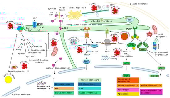 In human ATXN2 (UniProt Q99700), the InterPro sequence analysis shows the polyQ repeat at residues 166–188 to have a high alpha-fold confidence, and the aa residues 156–202 (YGPLTMSLKPQQQQQQQQQQQQQQQQQQQQQQQPPPAAANVRKPGGS), especially the residues downstream from the polyQ repeat, to display significant homology with the beta-sandwich domain in Sec23/24. The Sec23/24 heterodimer regulates the trafficking of membrane proteins, phospholipids, sphingolipids, and sterols via COPII-coated vesicles from the ER to the Golgi apparatus and to elongating cell protrusions [146]. This homology is not detected by the InterPro algorithm in other species. A fly dATX2 isoform indeed colocalizes with Sec23, but this was reported for isoform C, which starts from the LSm domain, similar to isoform A, but no Sec23 colocalization was found for isoform B, which starts 60 aa before the LSm domain begins [147]. While it remains unclear if Sec23 is relevant in this context, human ATXN2 indeed associates with the ER, the disruption of Ataxin-2 in flies and nematodes disrupts ER dynamics, and the polyQ-expansion in human and mouse ATXN2, as well as the deletion of mouse ATXN2, leads to disturbed sterol and sphingolipid homeostasis [51,54,55,137,147,148,149,150]. To what degree N-terminal sequences of Ataxin-2 contribute to these effects remains to be elucidated.