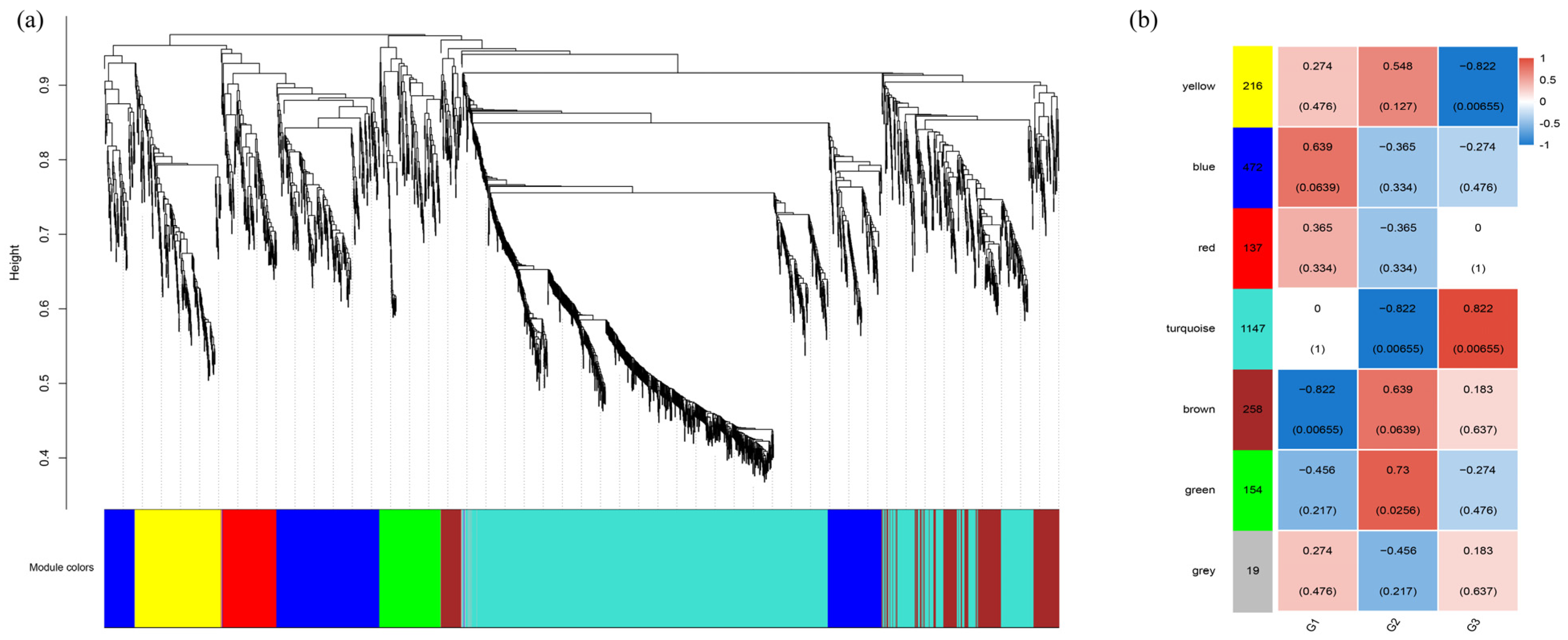 - Langfelder, P.; Horvath, S. WGCNA: An R package for weighted correlation network analysis. BMC Bioinform. 2008, 9, 559. [Google Scholar] [CrossRef]