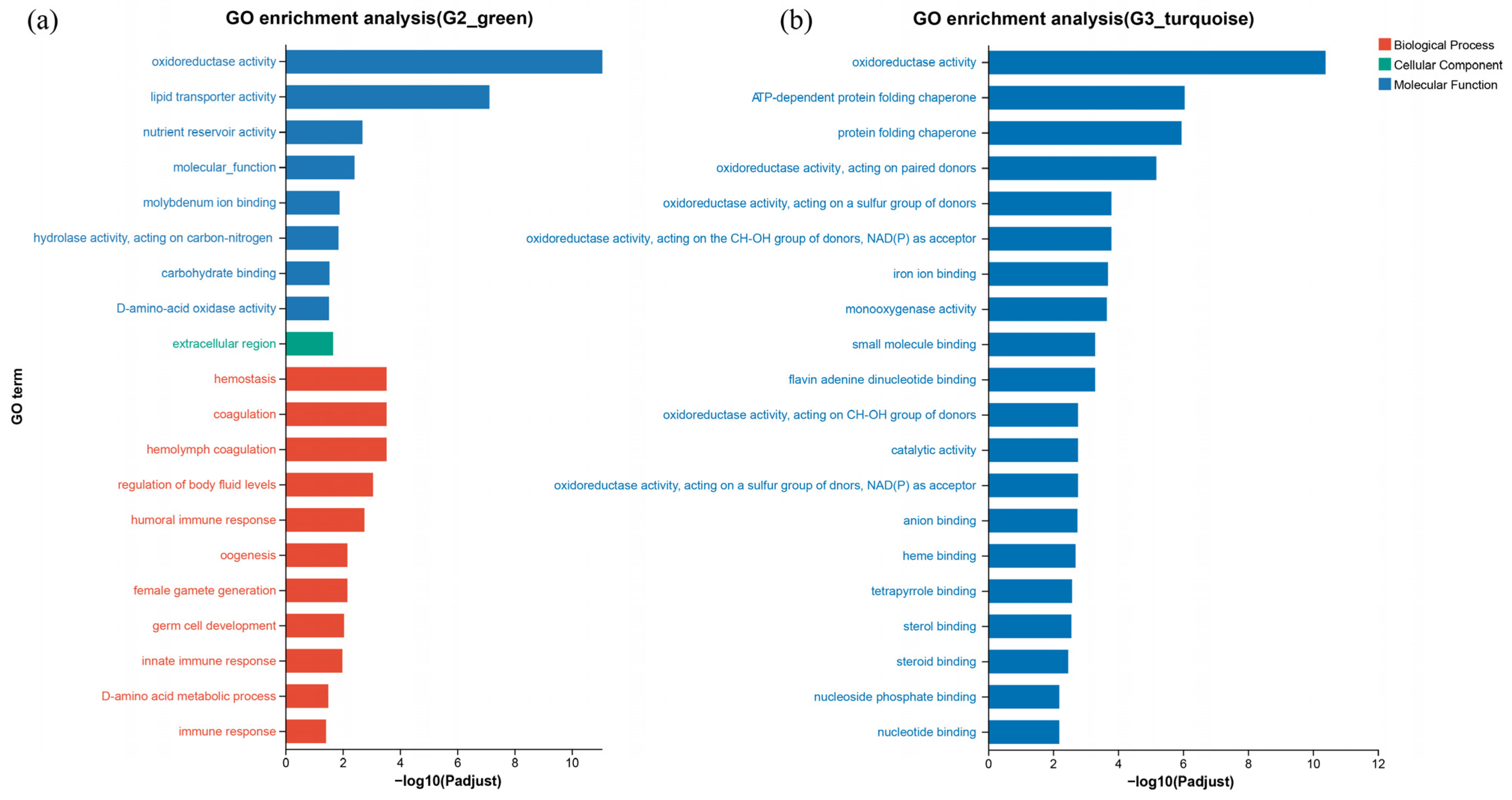 - Fan, Z.; Mao, J.; Wang, Y.; Tan, A.; Huang, Y.; Tian, Y.; Wang, X.; Hao, Z.; Ding, J.; Chang, Y. Transcriptomic WGCNA analyses reveal endoplasmic reticulum response of Patinopecten yessoensis under acute heat stress. Aquaculture 2024, 589, 740938. [Google Scholar] [CrossRef]