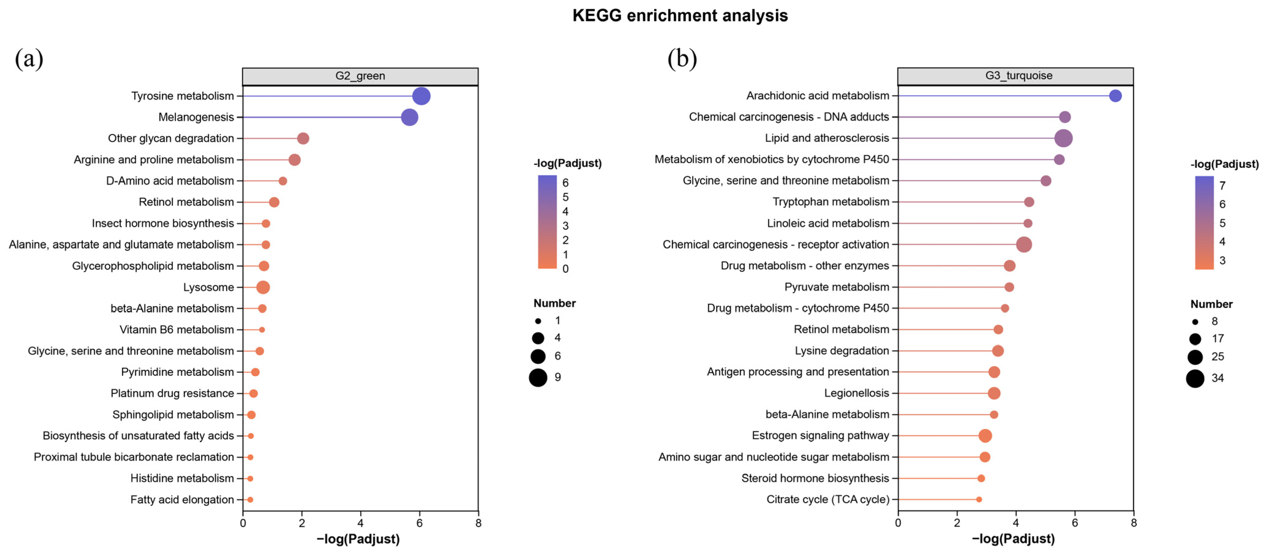 2.6. Weighted Gene Co-Expression Network Analysis (WGCNA) and Key Module Screening