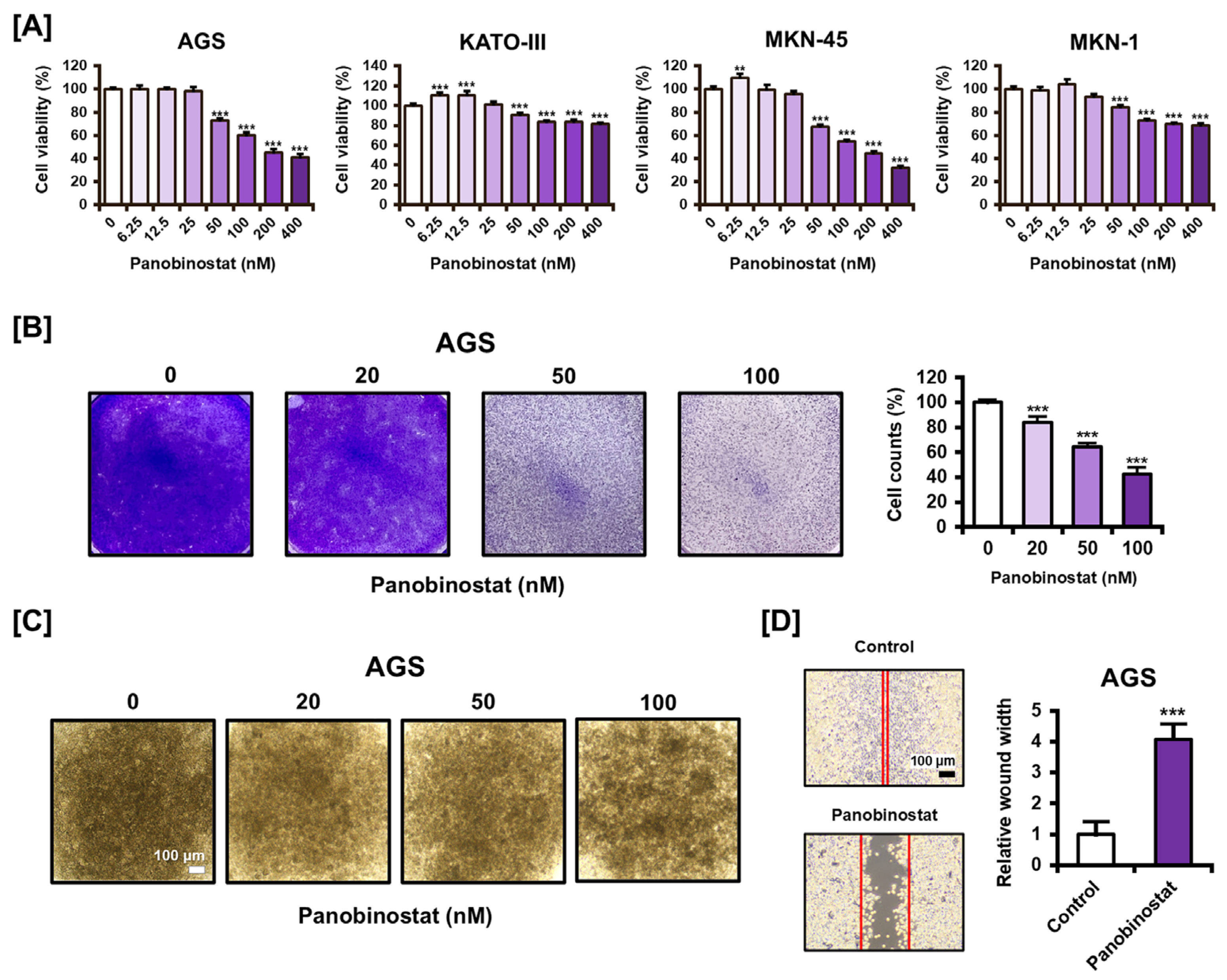 2.1. Panobinostat Exhibits Dose-Dependent Cytotoxic Effects and Inhibits Cell Migration in GC Cell Lines