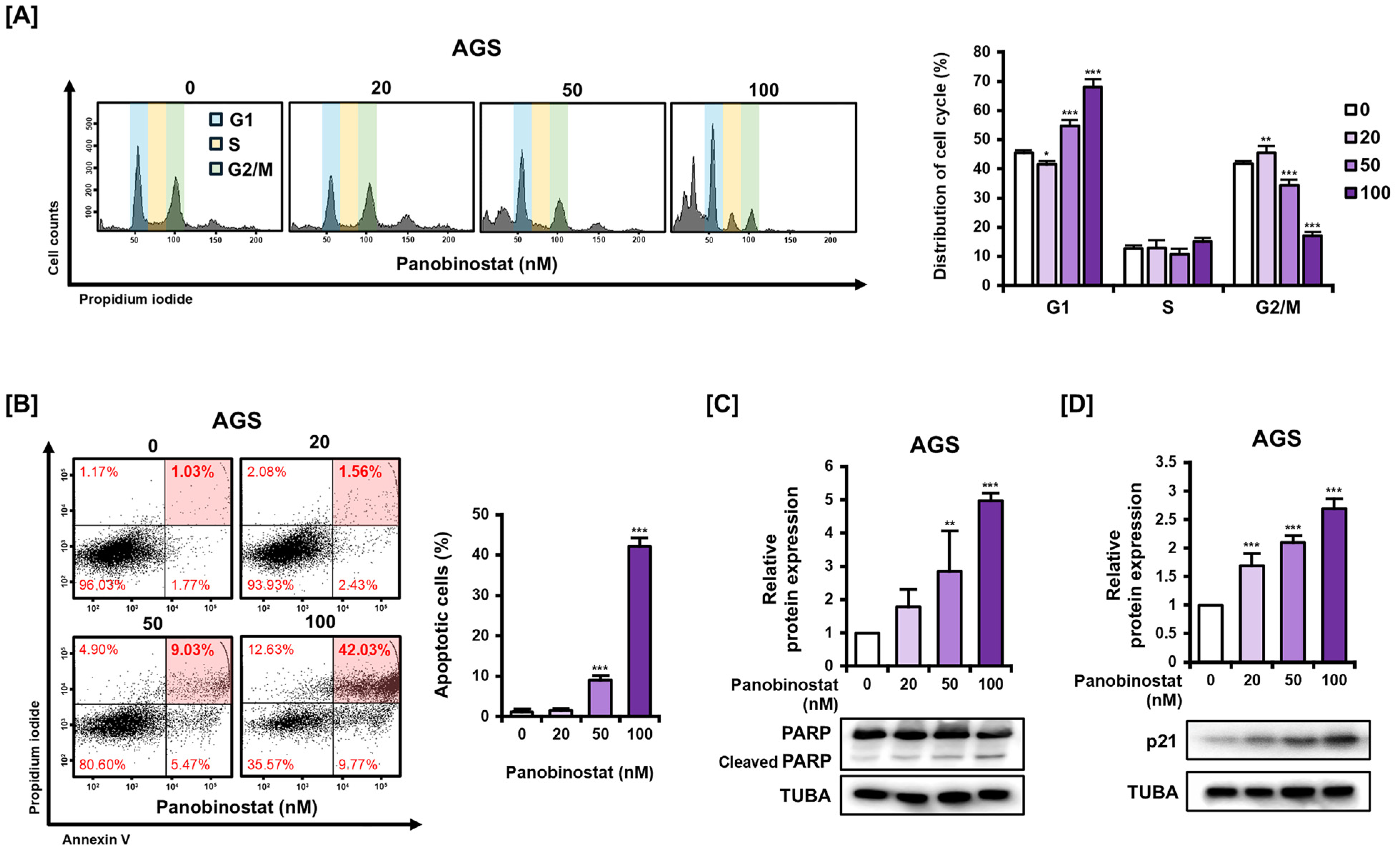 2.2. Panobinostat Induces G1 Cell Cycle Arrest and Apoptosis in AGS Cells