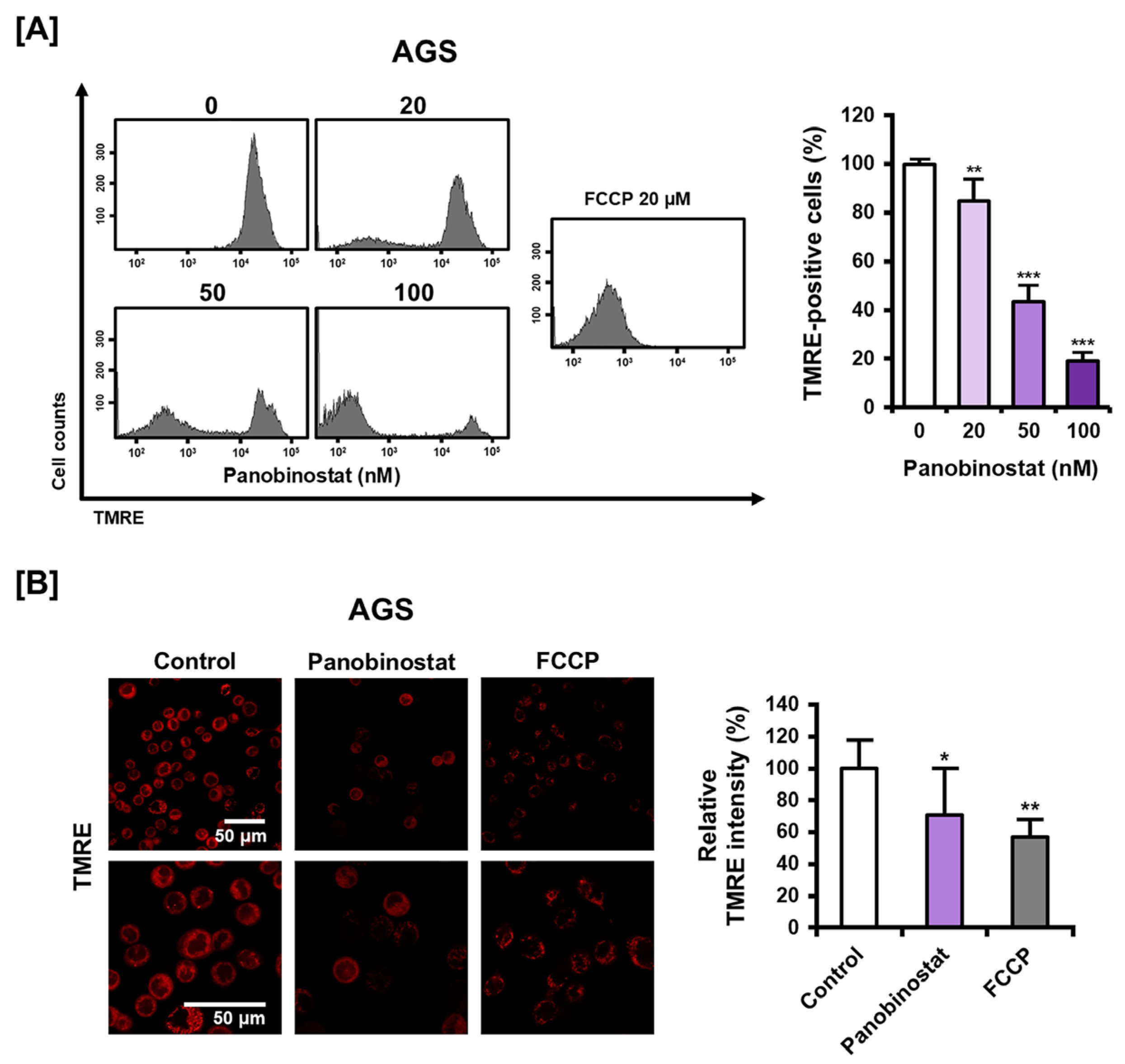 2.3. Panobinostat Disrupts Mitochondrial Membrane Potential (MMP) in AGS Cells