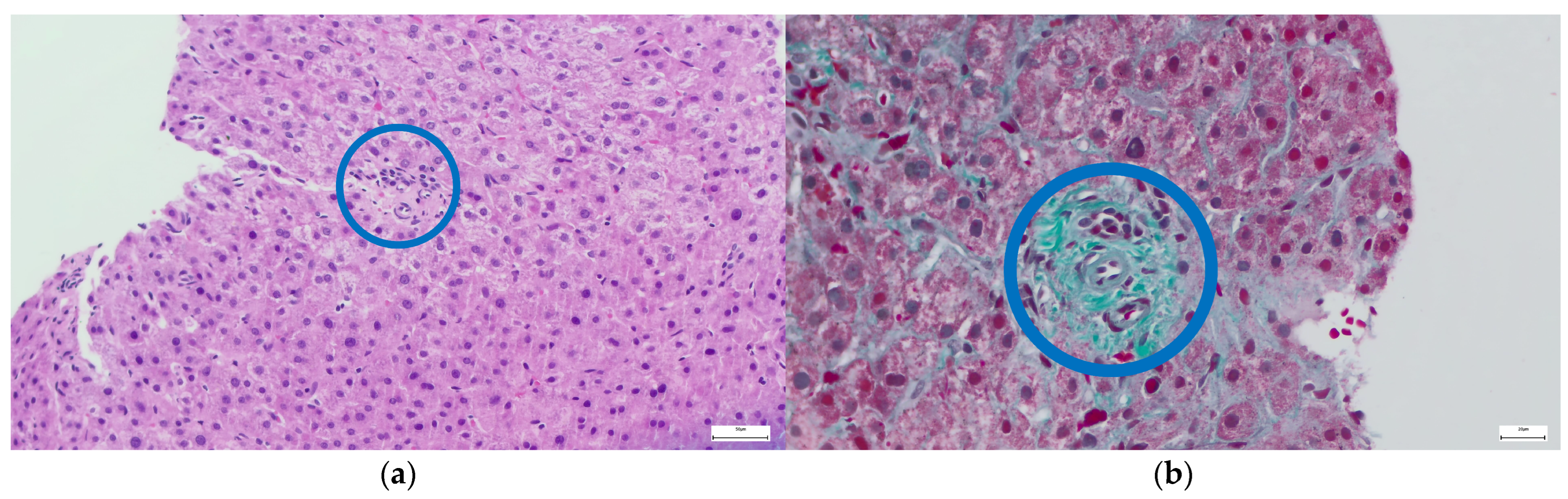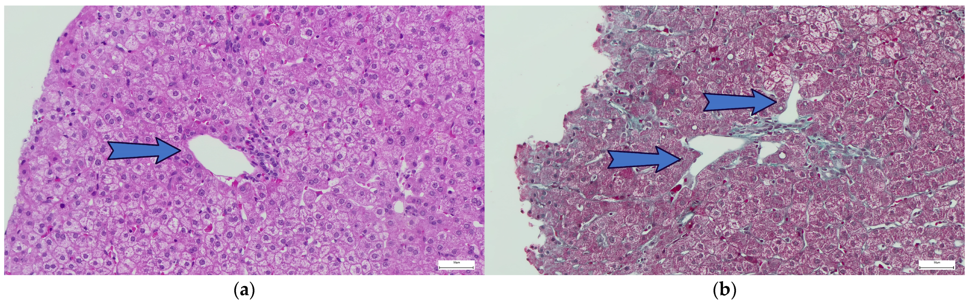 - Silva, H.; de Brito, C.G.X.; Hall, A.; Eden, N.; Somers, H.; Burke, N.; Burns, S.O.; Lowe, D.; Thorburn, D.; Halliday, N.; et al. Common variable immunodeficiency disorder (CVID)-related liver disease: Assessment of the main histological aspects using novel semiquantitative scoring systems, image analysis and correlation with clinical parameters of liver stiffness and portal hypertension. J. Clin. Pathol. 2024, 77, 709–716. [Google Scholar] [CrossRef] [PubMed]