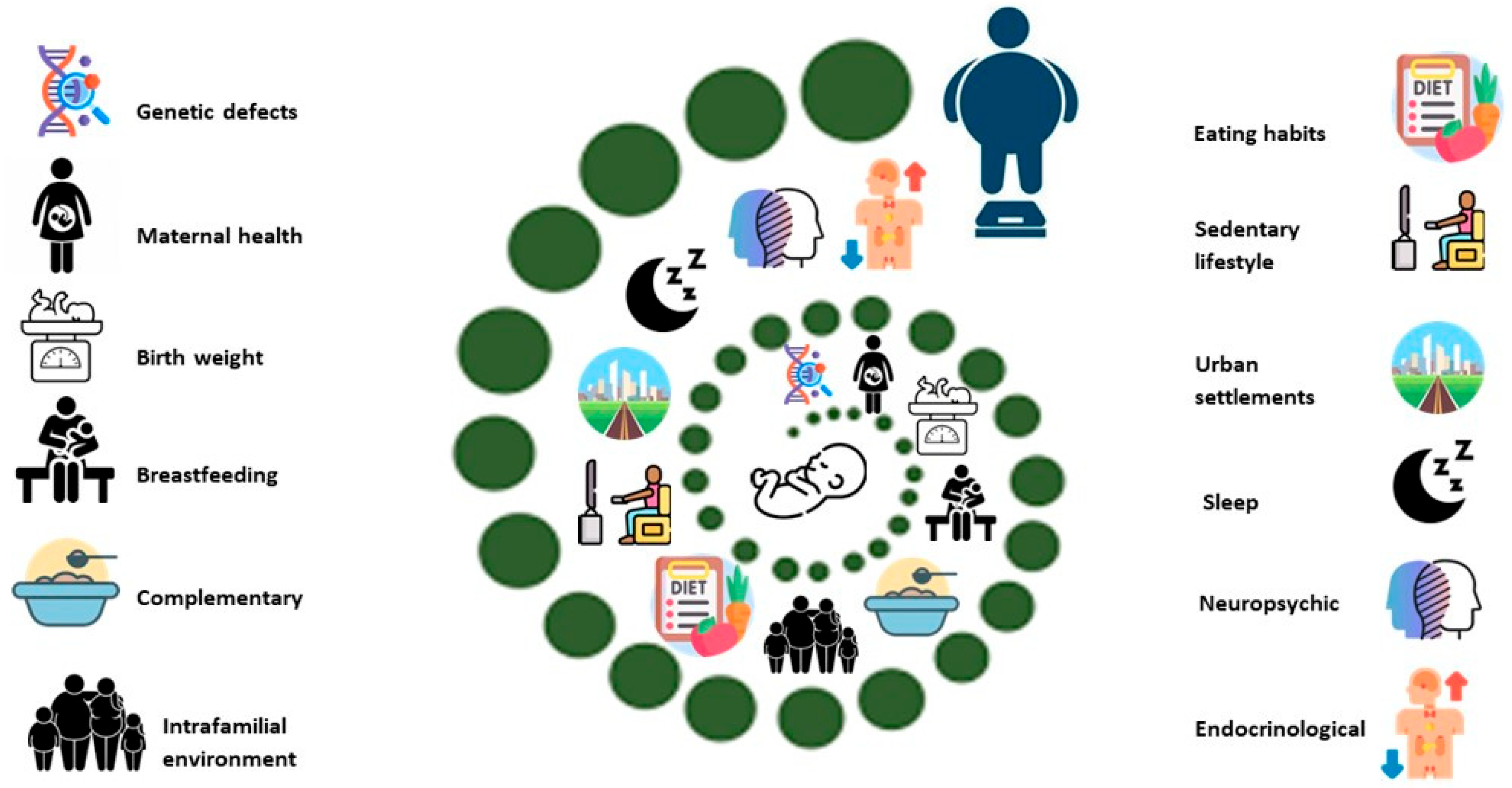 | Postnatal | Precarious socio-economic status Intrafamilial influence Religious considerations Unhealthy eating habits Sedentary behavior Prolonged time spent in front of screens Excessive parental control Characteristics of urban settlements (pollution, traffic, noise) Sleep deprivation Stressors Food marketing through social applications Psycho-somatic disorders Improper use of pharmacotherapy (e.g., psychostimulants, neuroleptics, antidepressants) Endocrinological imbalances |