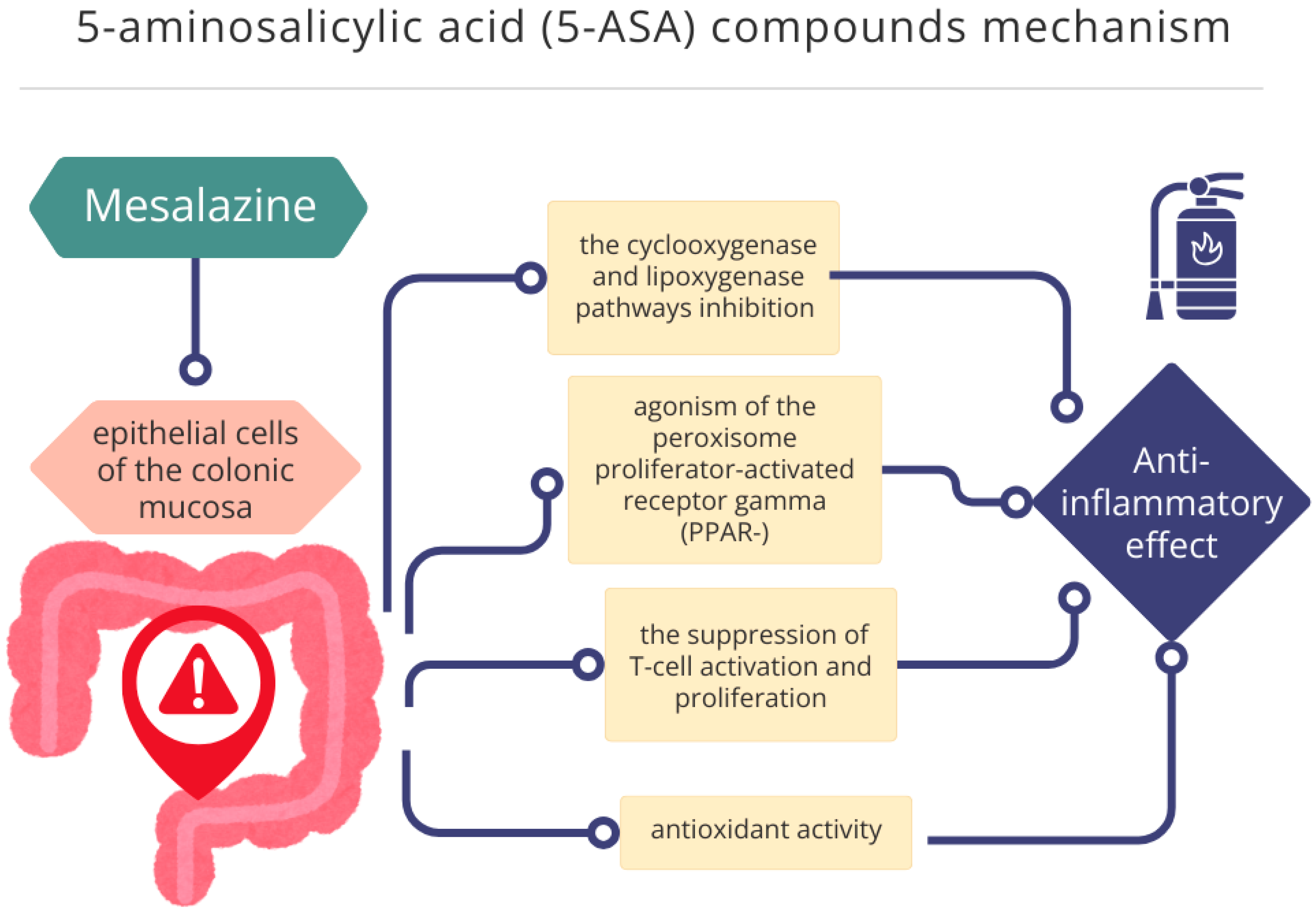 | Mesalazine; Mesalamine | mild to moderate UC | oral and rectal | active moiety of sulphasalazine | kidneys (urine) and liver (bile) | headache, abdominal pain, nausea, diarrhoea, rash inflammatory reactions, pancreatitis, cardiotoxicity, hepatotoxicity, musculoskeletal complaints, respiratory symptoms, nephropathies and sexual dysfunction [16,23,24] | |