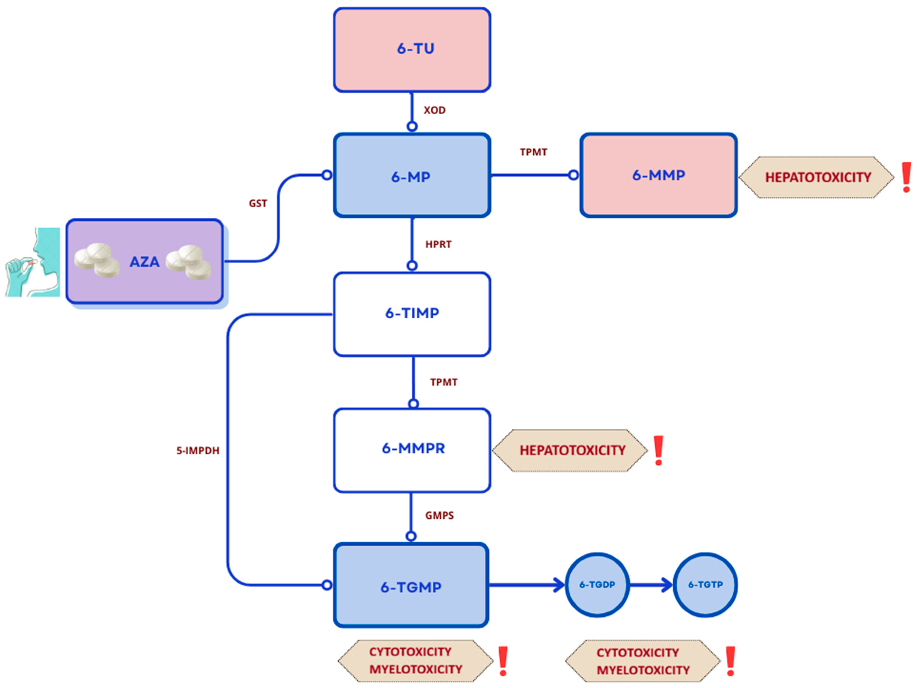 | Thiopurines | Azathioprine (AZA) and 6-mercaptopurine (6-MP) | steroid-refractory moderate to severe UC; | oral | Azathioprine is a prodrug of 6-mercaptopurine; | kidneys (urine) as secondary metabolites | leukopenia, bone marrow suppression, hepatotoxicity and kidney damage, gastric disorders, and pancreatitis. Long-term therapy has been associated with an increased risk of non-melanoma skin cancer, lymphoma, and cervical cancer [29,40] |