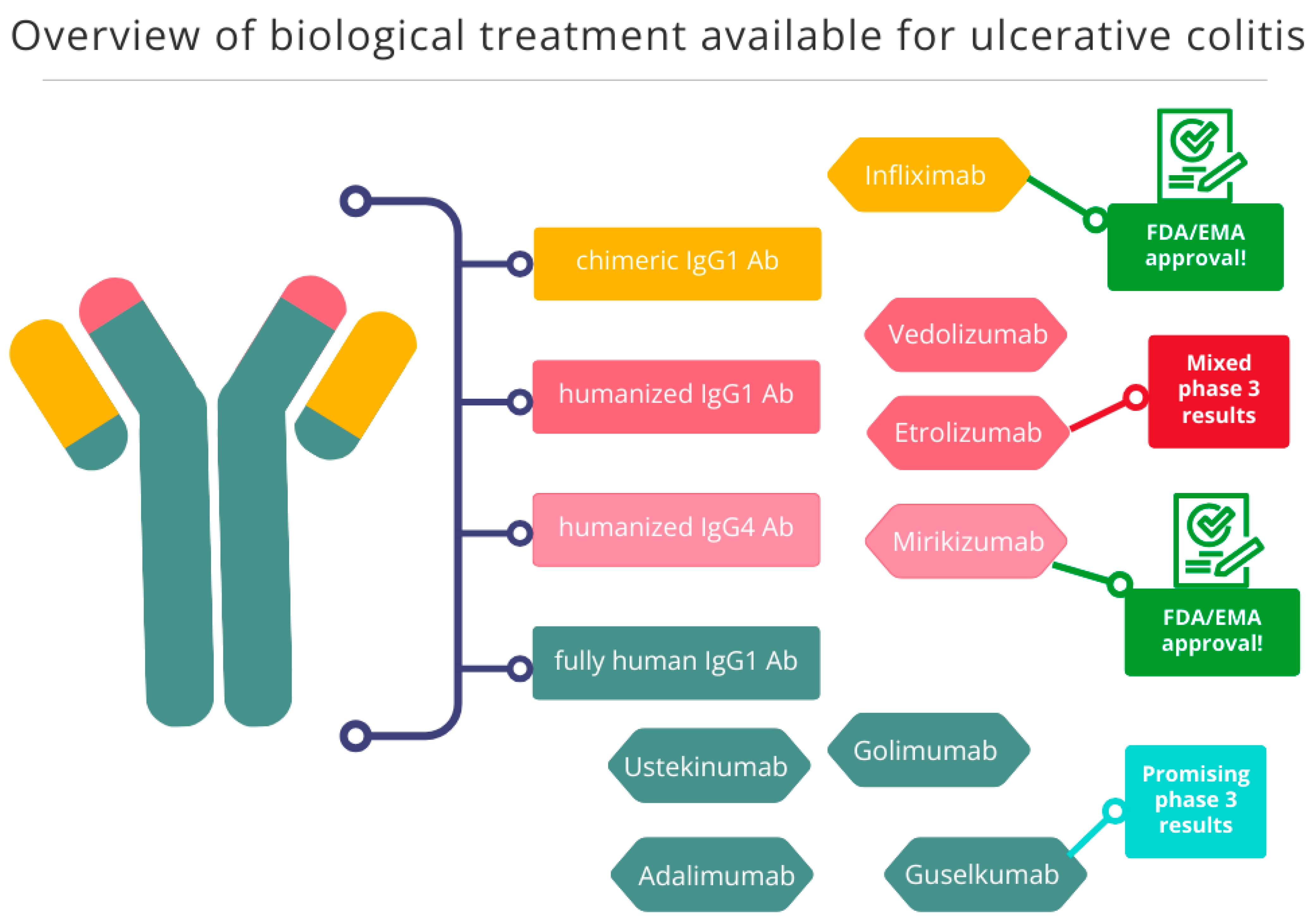 | Etrolizumab | humanized monoclonal antibody against the β7 subunit of α4β7 and αEβ7 integrins | intravenous injection; subcutaneous injection | β7 subunit of α4β7 and αEβ7 integrin heterodimers | [53] |