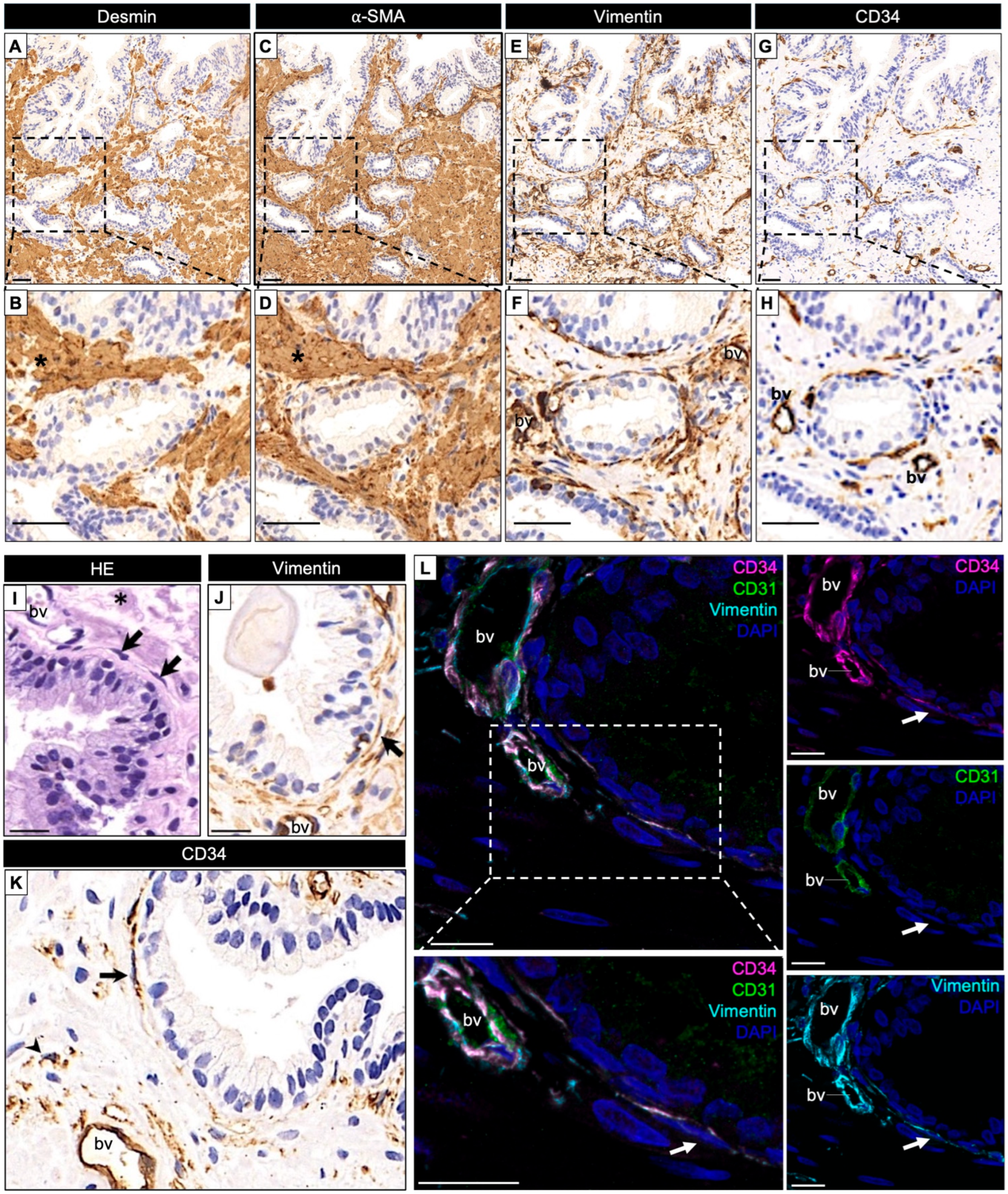 - Gevaert, T.; Lerut, E.; Joniau, S.; Franken, J.; Roskams, T.; De Ridder, D. Characterization of subepithelial interstitial cells in normal and pathological human prostate. Histopathology 2014, 65, 418–428. [Google Scholar] [CrossRef]