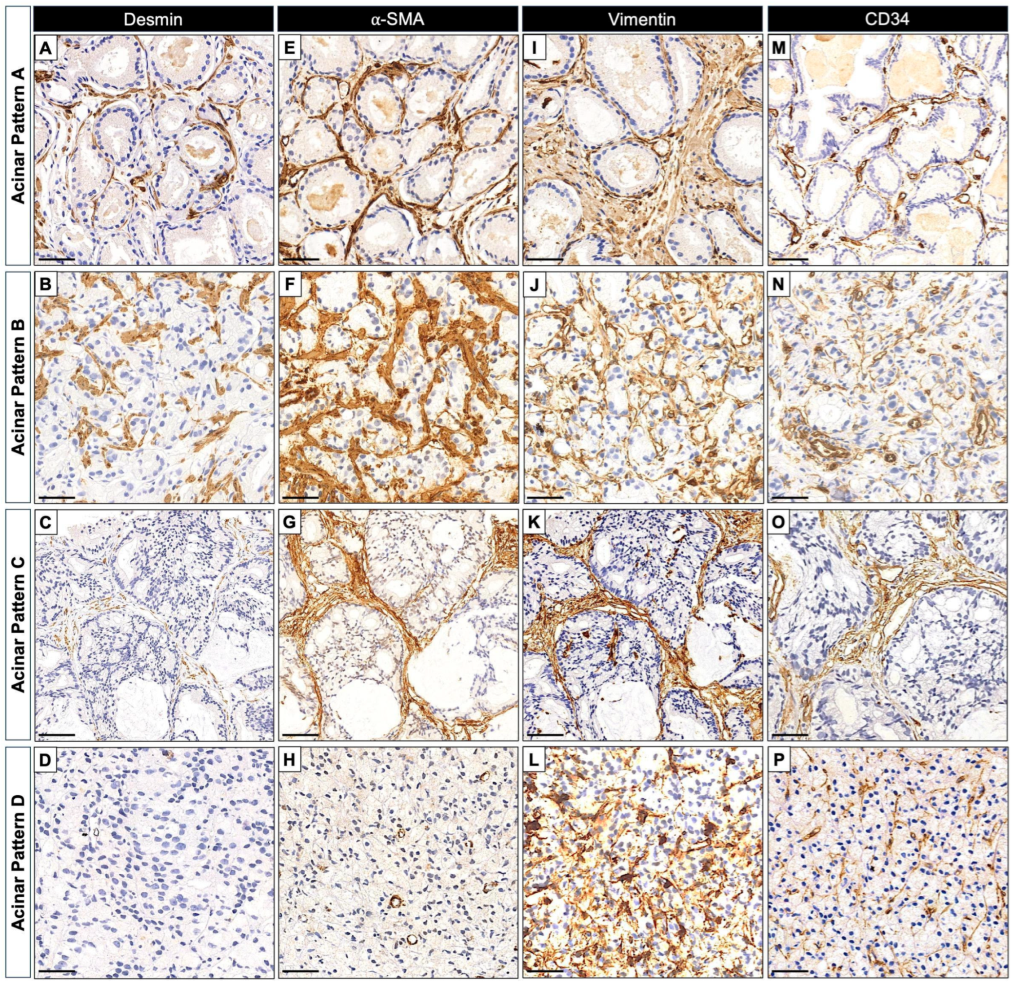 2.2. Distribution of α-SMA, Desmin, Vimentin, and CD34 in Normal and PCa Stroma