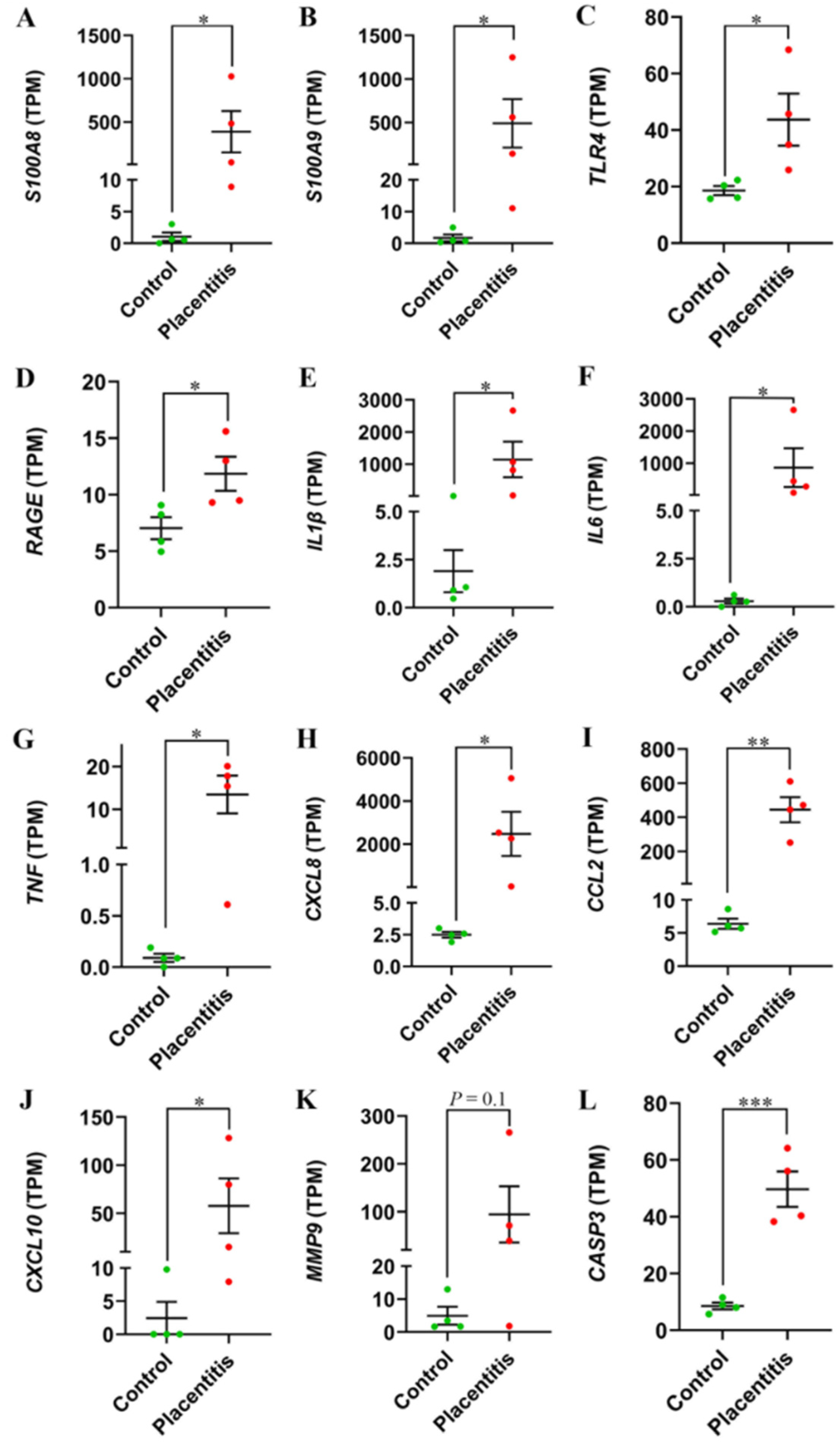 2.3. Changes in Gene Expression of S100A8 and S100A9 and Their Downstream Factors in Equine CA During Clinical Ascending Placentitis