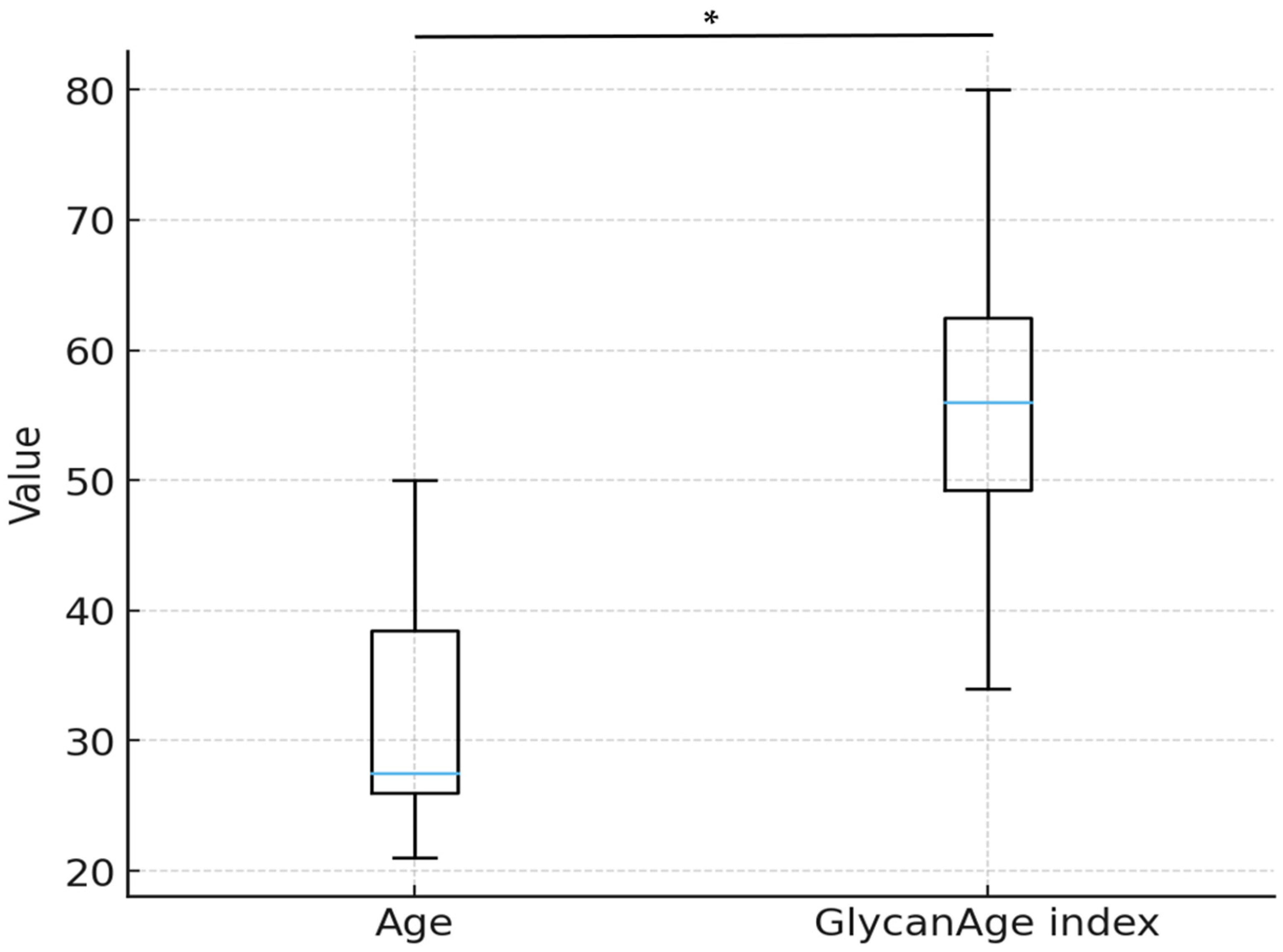 Moreover, analysis of the IgG glycome revealed a significantly elevated GlycanAge index, a biomarker of biological age derived from IgG glycosylation patterns. This finding is consistent with prior studies linking altered N-glycosylation to metabolic dysfunction and chronic low-grade inflammation (
