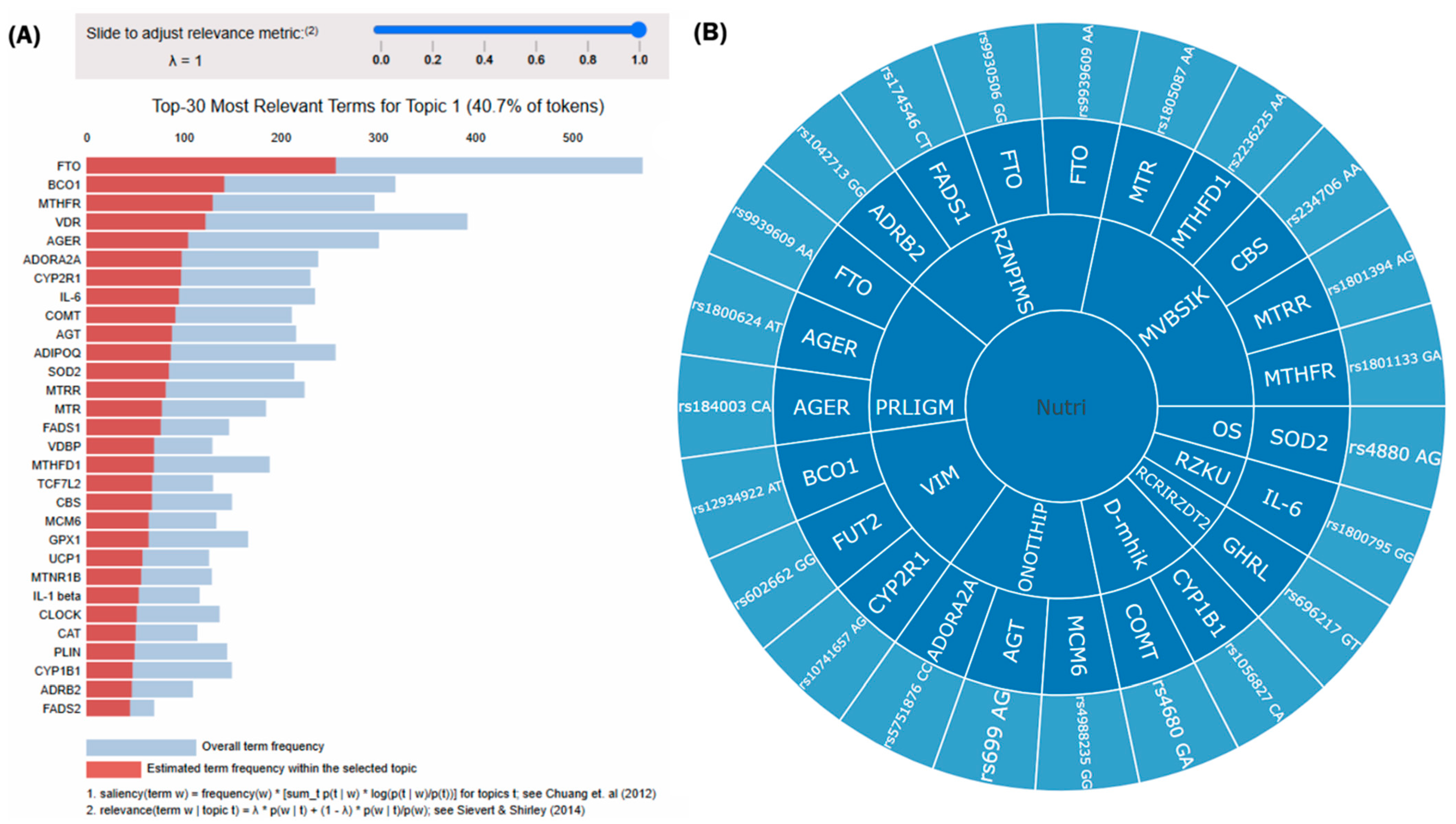 The first step in data analysis involved uploading the patient’s nutrigenetic report. The platform extracted the relevant data from the file using the file template, which is then forwarded to the clustering segment. The categorization process was done in two steps: dimensionality reduction and clustering. Due to the high complexity of the data in the nutrigenetic report, the features of each sample were compressed into two continuous components, using dimensionality reduction algorithms including principal component analysis (PCA) and uniform manifold approximation and projection (UMAP). When scaled to two dimensions, the clustering of data points was conducted using a Euclidean distance-based clustering algorithm, including K-Means. Using this data processing pipeline, the digital platform categorized patients into one of five nutrigenetic clusters. Feature importance for each cluster was inferred from topic-specific term probabilities derived from an unsupervised Latent Dirichlet Allocation (LDA) model, representing relative relevance within the learned topic structure.