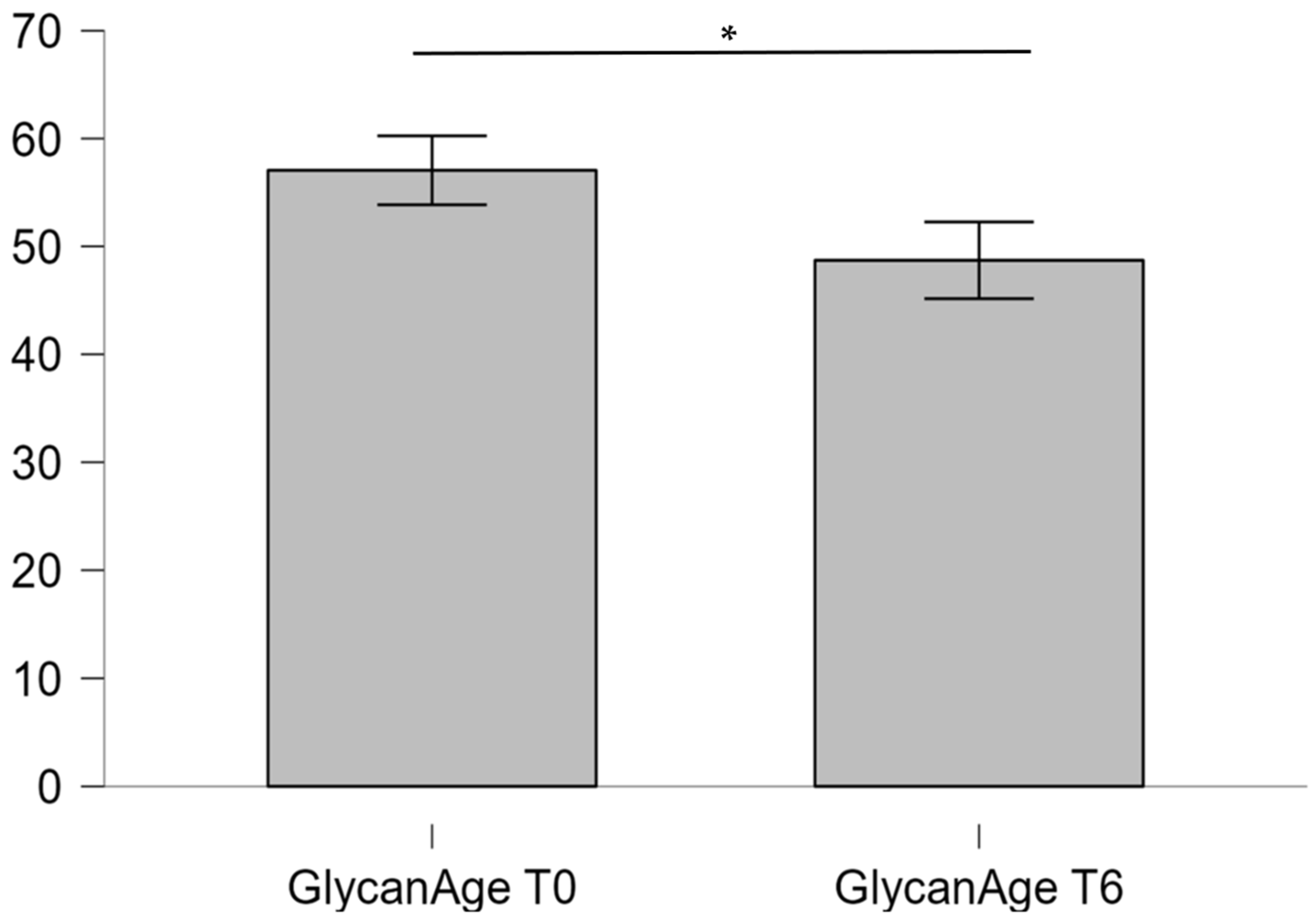 The markedly increased GlycanAge index relative to chronological age observed in this cohort reflects the profound systemic impact of obesity on biological aging. IgG glycosylation patterns are tightly regulated by inflammatory and metabolic cues; pro-inflammatory, agalactosylated glycans dominate in obesity and type 2 diabetes, reflecting a state of chronic immune activation. The elevated GlycanAge index thus provides molecular evidence of accelerated biological aging driven by obesity-associated inflammation. The significant reduction in GlycanAge index after six months of intervention suggests that these glycomic signatures are reversible and sensitive to metabolic improvement [