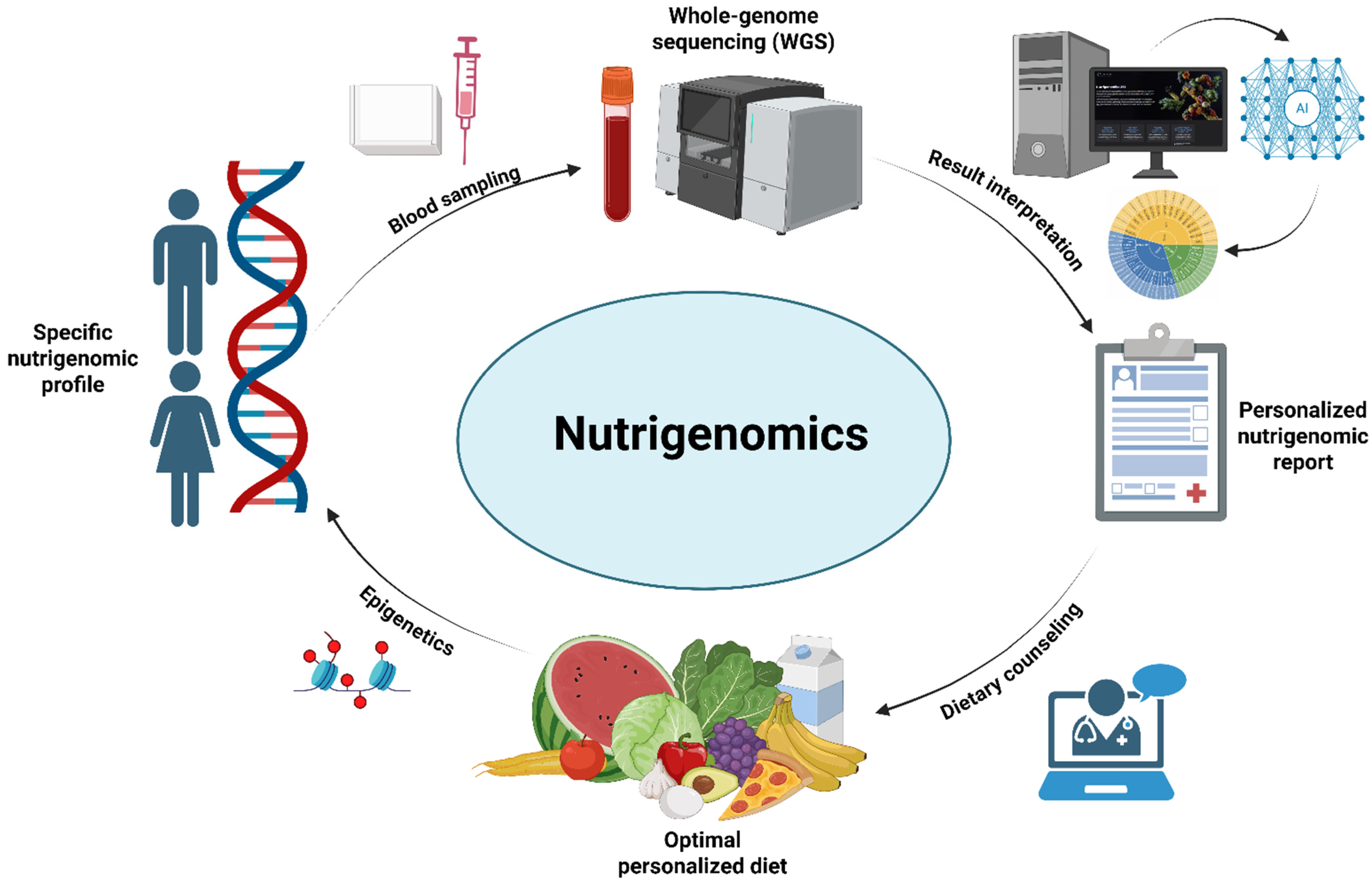 The second step of the analysis involved the generation of a personalized report for dietary recommendations. The internal database of the platform associates each of the five clusters with a set of foodstuffs that would be best suited for an individual with the established nutrigenetic profile. Once the patient has been sorted into a cluster, the nutrigenetic report is generated and can be exported for clinical use. Finally, the physician or nutritionist may use this report during consultation with the individual to more easily create a personalized dietary plan that takes genetics into account (