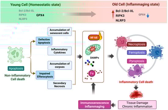 From apoptosis to inflammatory cell death: a vicious cycle underlying immune aging. This schematic illustrates an age-associated shift in cell death programs from homeostatic apoptosis toward inflammatory forms of regulated cell death, including necroptosis, pyroptosis, and ferroptosis. Comparative expression patterns of key regulatory molecules in cells from young versus aged conditions are indicated at the top, highlighting increased Bcl-2/Bcl-XL, RIPK3 and NLRP3 expression (the red upward arrow) and reduced GPX4 levels in aged cells (the blue downward arrow). During aging, reduced efficiency of apoptosis and a decline in efferocytosis lead to the accumulation of dysfunctional cells and cellular debris within tissues. These uncleared apoptotic cells progressively undergo secondary necrosis, resulting in the release of damage-associated molecular patterns (DAMPs) and pro-inflammatory cytokines. The persistent presence of these signals sustains NF-κB activation and reinforces a chronic inflammatory milieu. In parallel, mitochondrial dysfunction–derived reactive oxygen species (ROS) and iron dysregulation further exacerbate cellular stress, shifting cell fate decisions away from immunologically silent apoptosis toward inflammatory forms of cell death, such as necroptosis, pyroptosis and ferroptosis. The ensuing release of additional inflammatory mediators amplifies tissue damage, accelerates immune cell dysfunction and senescence, and establishes a self-perpetuating vicious cycle that underlies immune aging and inflammaging. Created in BioRender. Kang, T. (2026). https://BioRender.com/ua8m688 (accessed on 2 February 2026).