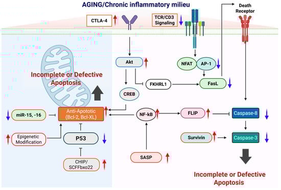 Molecular mechanisms underlying impaired apoptotic control during aging. This schematic depicts how aging and a chronic inflammatory milieu progressively disrupt apoptotic regulation at multiple molecular checkpoints, leading to incomplete or defective apoptosis and the accumulation of apoptosis-resistant cells. In aged immune cells, increased expression of inhibitory receptors such as CTLA-4 and attenuated TCR/CD3 signaling weaken pro-apoptotic transcriptional programs mediated by NFAT and AP-1, resulting in reduced FasL expression and impaired activation of the extrinsic apoptotic pathway. At the same time, pro-survival signaling pathways, including Akt–CREB and persistent NF-κB activation, are enhanced and drive the upregulation of anti-apoptotic molecules such as Bcl-2, Bcl-XL, FLIP, and survivin, while suppressing caspase-8 and caspase-3 activation downstream of death receptor signaling. Within the intrinsic pathway, aging-associated mitochondrial alterations, epigenetic modifications, reduced expression of pro-apoptotic microRNAs (miR-15 and miR-16), and enhanced CHIP/SCFFbx22-mediated p53 degradation or functional suppression further reinforce resistance to apoptosis. In parallel, chronic inflammatory cues and senescence-associated secretory phenotype (SASP) signaling sustain NF-κB–dependent survival programs, thereby stabilizing an anti-apoptotic state. Red upward arrows indicate pathways or factors that are increased with aging, whereas blue downward arrows denote those that are diminished. Created in BioRender. Kang, T. (2026) https://BioRender.com/uk3uq46 (accessed on 2 February 2026).