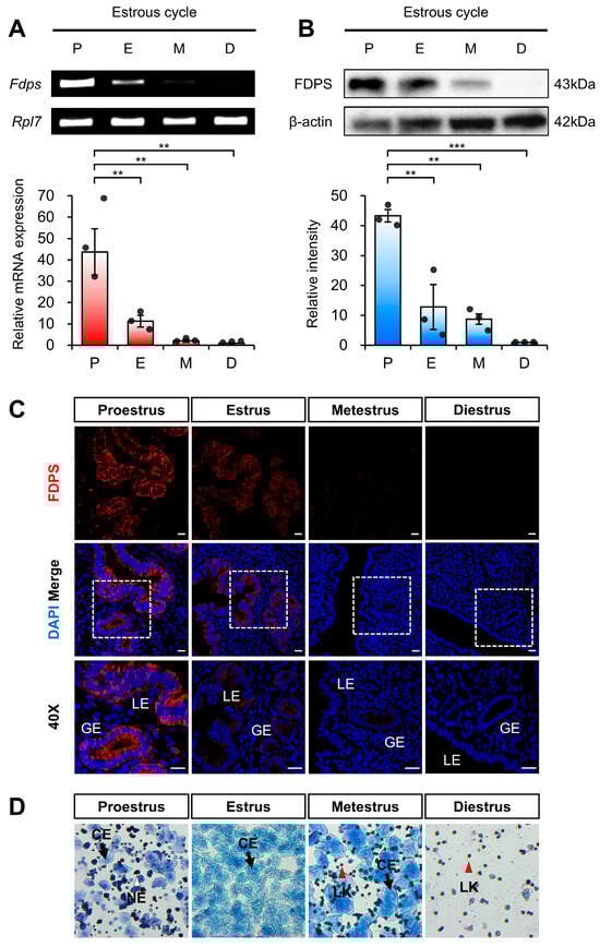 RT-PCR and qRT-PCR analyses revealed that Fdps expression was significantly increased during the proestrus stage, followed by a marked decrease as the cycle progressed through the estrus, metestrus, and diestrus stages (Figure 2A).
