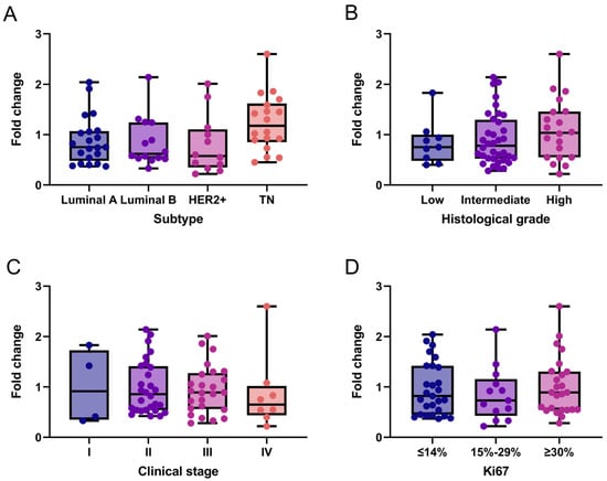 We performed an exploratory analysis of LALBA gene expression in breast cancer tissues and descriptively evaluated its distribution across patients’ clinicopathological characteristics. Overall, LALBA expression was generally low across breast cancer subtypes, with 76.9% (n = 50) of patients exhibiting fold-change values ≤ 1. In contrast, 13.8% (n = 9) of patients showed moderate expression levels (fold-change between 1 and 5), and only 9.2% (n = 6) exhibited markedly high expression (fold-change > 5). These high-expression cases were found exclusively in the HER2+ and triple-negative subtypes (Figure 1A), which also corresponded to intermediate to high histological grades in the analyzed cohort (Figure 1B). No statistically significant associations was observed between LALBA expression and clinical stage (Figure 1C) or Ki67 levels (Figure 1D).