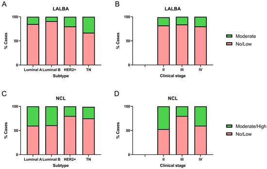 Immunohistochemical detection of LALBA and NCL in patient biopsies. LALBA and NCL expression by IHC in breast cancer biopsies across molecular subtypes (A,C) and clinical stages (B,D). Both markers showed significant differences in expression among molecular subtypes. No significant differences were observed in LALBA expression with respect to clinical stage; however, a statistically significant association was found between clinical stage and NCL immunohistochemical expression (Chi-square and Fisher’s exact tests).