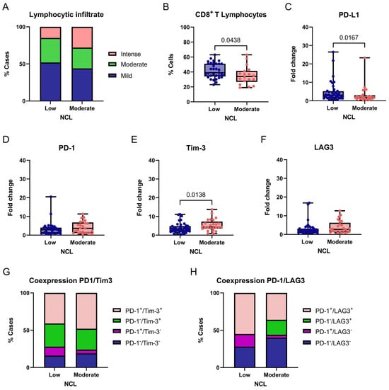 Association between NCL expression and immune-related markers in breast tumors. Comparison of degree of lymphocytic infiltration (A), percentage of CD8+ T cells (B), PD-L1 (C), PD-1 (D), Tim-3 (E), and LAG3 (F) expression levels, and PD-1/Tim-3 or PD-1/LAG3 coexpression (G,H) according to NCL expression groups (Low vs. Moderate/High). Box-and-whisker plot showing individual data points. Boxes represent the interquartile range (Q1–Q3) with the median line; whiskers extend to the minimum and maximum values. n = 65. Statistically significant differences were observed in the percentage of CD8+ T lymphocytes and PD-L1 and Tim-3 expression (Chi-square and Fisher’s exact tests or Mann–Whitney U test).