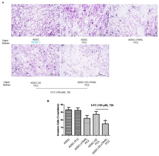 We next assessed the tumor-tropic migration ability of the ADSC.CD.sTRAIL cells, as effective homing is pivotal for delivering therapeutic genes to tumors. In transwell invasion assays (Figure 4A), both parental hTERT-ADSCs and ADSC.CD.sTRAIL cells exhibited strong migratory tropism toward PC3 prostate cancer cell-conditioned medium. ADSC.sTRAIL cells exhibited also strong migratory tropism toward PC3 prostate cancer cell-conditioned medium. Quantitatively, ADSC.CD.sTRAIL with 5-FC toward PC3 showed reduced migration compared to ADSC.sTRAIL; their migration toward PC3 was ~4.2-fold higher than toward control medium (fibroblast WPMY-1 conditioned medium), which was comparable to the parental ADSC’s enhancement (~4.8-fold)—indicating that introducing CD/TRAIL did not impair the cells’ migratory responsiveness. In fact, ADSC.CD.sTRAIL cells showed slightly higher migration than parental ADSCs (Figure 4B), although migration was somewhat reduced if 5-FU was present (likely because some ADSC.CD.sTRAIL undergo self-killing when converting 5-FC to 5-FU; see below). These results demonstrate that the engineered ADSCs maintain the inherent tumor-seeking behavior of MSCs.