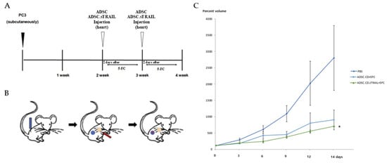 Therapeutic efficacy of ADSC.CD.sTRAIL with 5-FC in vivo (PC3 CRPC subcutaneous tumor model). Male nude mice (n = 5 per group) with established PC3 tumors were treated as follows: PBS + 5-FC (control), ADSC.CD + 5-FC, or ADSC.CD.sTRAIL + 5-FC. 5-FC (500 mg/kg IP) was given daily (5 days on, 2 off) for 14 days to all groups. (A) Schematic summary of the treatment. (B): Illustration of the induction of prostate cancer using PC3, systemic injection of hTERT-ADSC.CD. sTRAIL cells and migration of the gene-modified stem cells toward the prostate cancer. Blue: PC3; red: hTERT-ADSC.CD.sTRAIL cells. (C): The inhibitory effects of 5-FC showed better effects with ADSC.CD.sTRAIL +5-FC than those with ADSC.CD or 5-FC alone. Data are mean ± SE. Statistical notes: Two-way ANOVA showed a significant interaction of treatment and time; * p < 0.05. X-axis: date, Y-axis: Percent volume means tumor volume at each time point expressed as a percentage of the initial tumor volume prior to treatment. hTERT-ADSC.CD.sTRAIL = CD and TRAIL overexpressing hTERT-immortalized human adipose stem cells.
