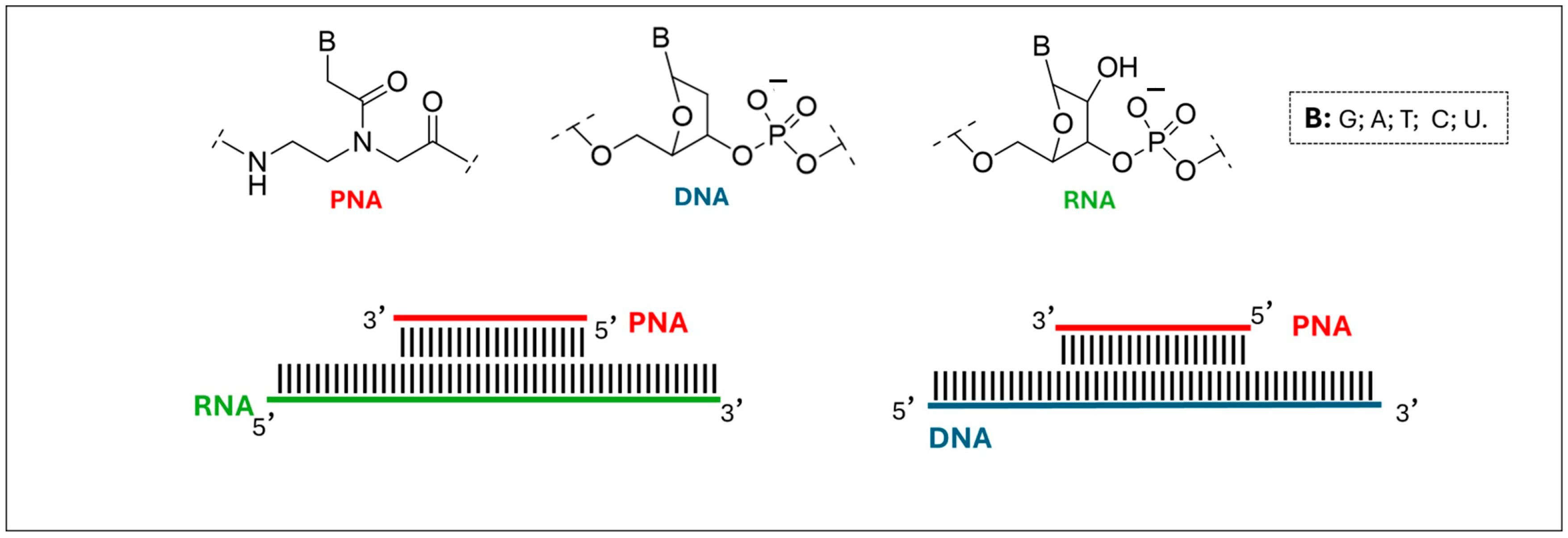 - Sannigrahi, A.; De, N.; Bhunia, D.; Bhadra, J. Peptide nucleic acids: Recent advancements and future opportunities in biomedical applications. Bioorg. Chem. 2025, 143, 108146. [Google Scholar] [CrossRef] [PubMed]