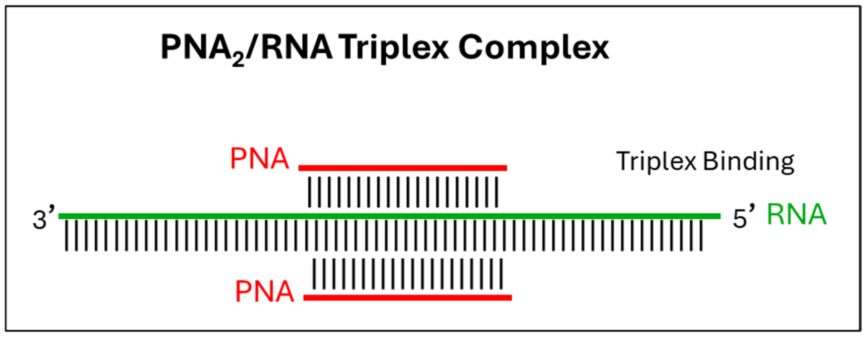 - Katkevics, M.; MacKay, J.A.; Rozners, E. Triplex-forming peptide nucleic acids as emerging ligands to modulate structure and function of complex RNAs. Chem. Commun. 2024, 60, 1999–2008. [Google Scholar] [CrossRef]