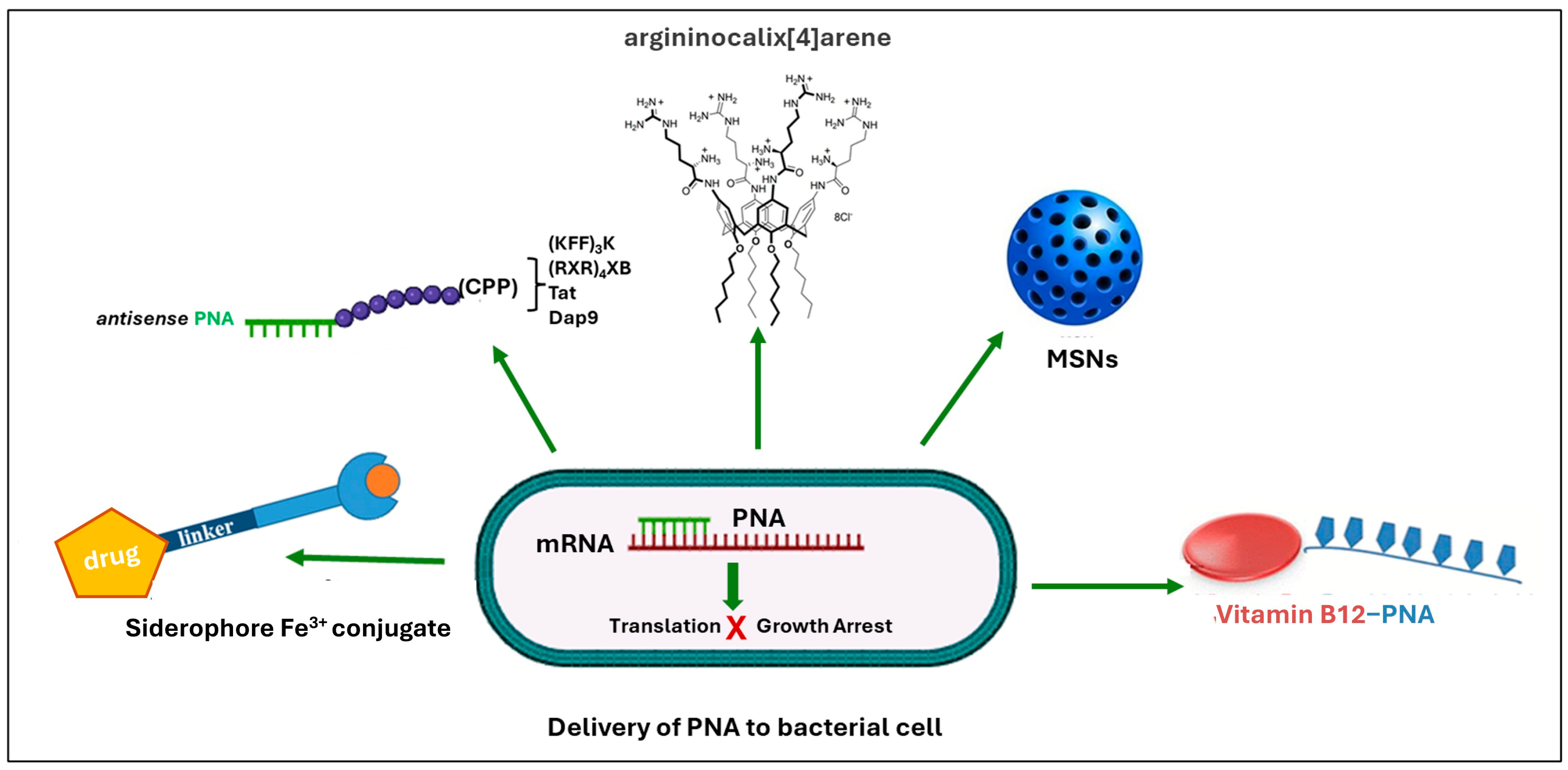 - Avitabile, C.; Cerasa, M.T.; D’Aniello, A.; Saviano, M.; Moccia, M. Recent cutting-edge technologies for the delivery of peptide nucleic acid. Chem.–Eur. J. 2025, 31, e202500469. [Google Scholar] [CrossRef] [PubMed]