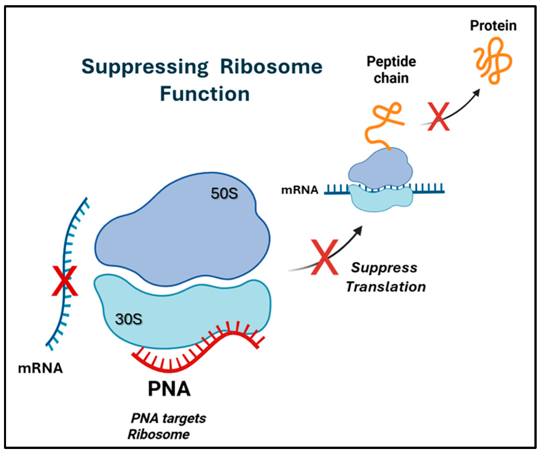 | Watson–Crick duplex (structured RNAs, e.g., rRNA) | PNA binds to accessible or partially accessible RNA regions (loops, bulges) and can invade short duplex or hairpin structures by strand displacement. | Some evidence. Growth inhibition reported, but accessibility of rRNA/structured RNA limits design space. | [34] |