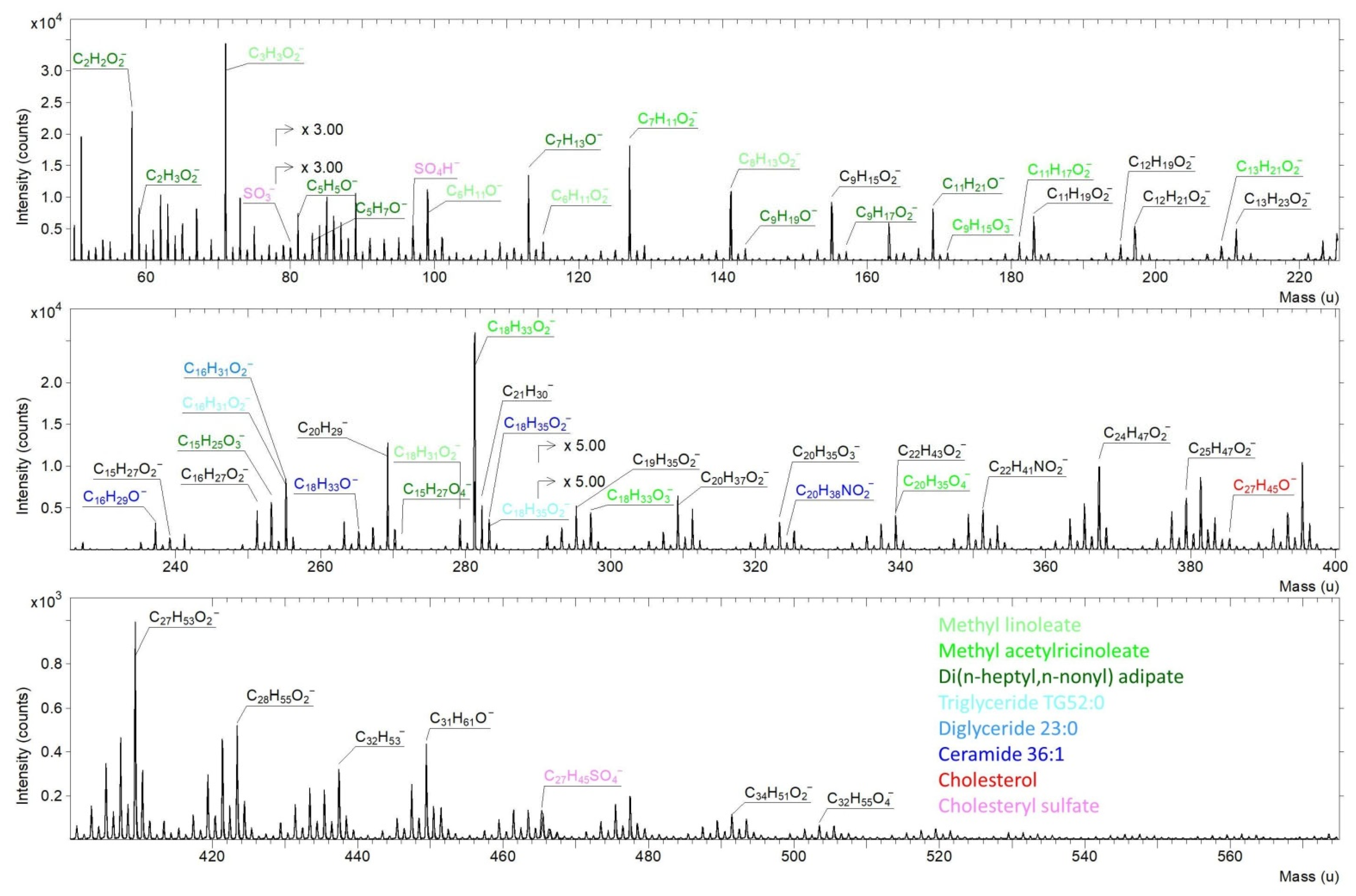 - Denbigh, J.L.; Lockyer, N.P. ToF-SIMS as a Tool for Profiling Lipids in Cancer and Other Diseases. Mater. Sci. Technol. 2015, 31, 137–147. [Google Scholar] [CrossRef]