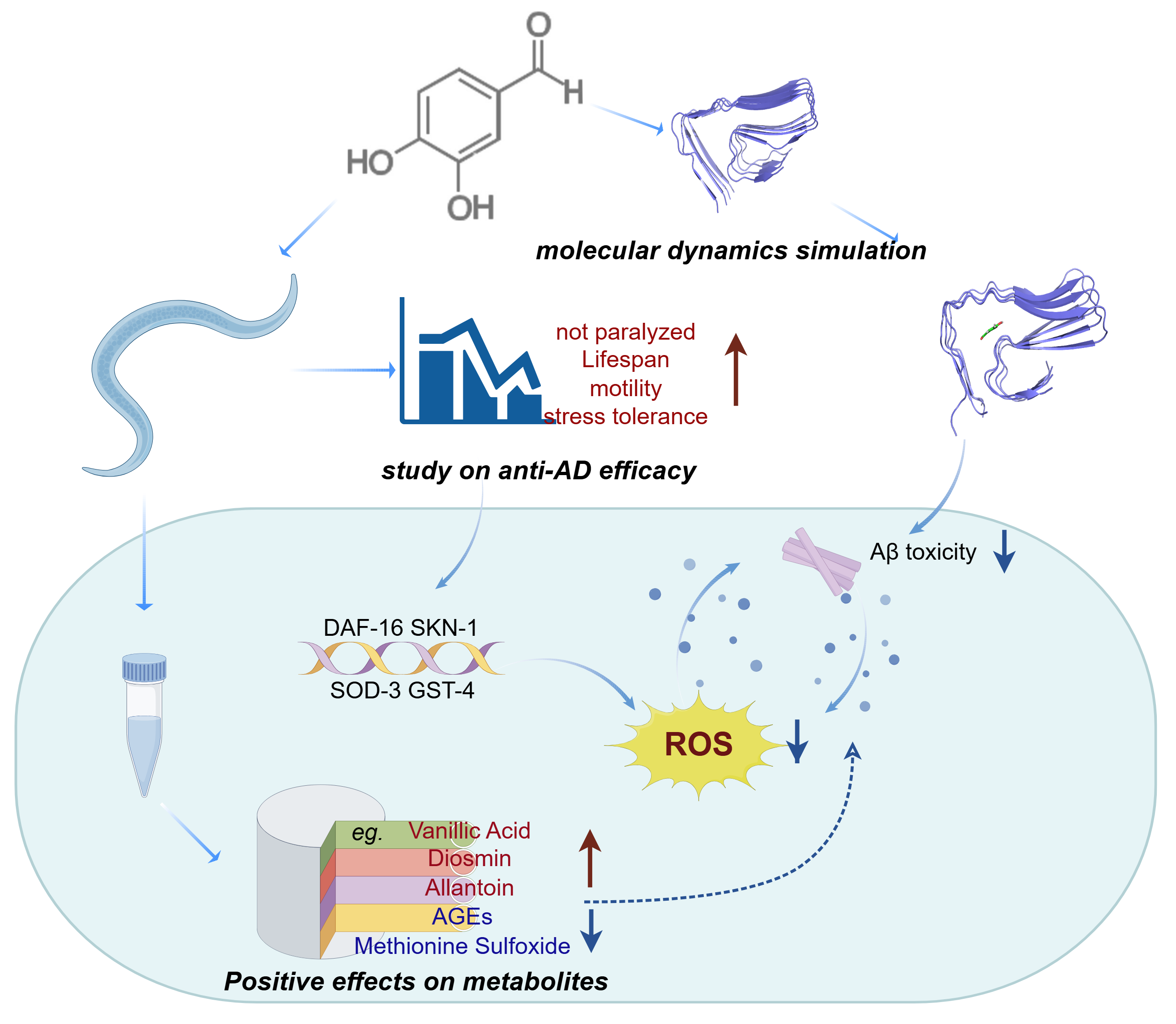 In this study, we employ molecular dynamics simulations combined with a C. elegans model to investigate the protective effects of DBD against Aβ toxicity and its underlying mechanisms. Molecular dynamics simulations suggested that DBD can bind to and destabilize Aβ protofibrils. In the AD C. elegans model, DBD treatment led to multifaceted phenotypic improvements, including delayed paralysis progression, enhanced resistance to oxidative stress, improved locomotor behavior, and extended lifespan within the model context. To explore the mechanisms involved, we assessed relevant biochemical markers and found that DBD treatment reduced levels of reactive oxygen species (ROS) and lipofuscin, as well as Aβ deposition in the worms. Additionally, comprehensive target metabolomics and GFP reporter gene analyses reveal the mechanisms underlying DBD’s anti-AD activity. The results of this study can guide future research on the therapeutic potential of Gastrodia elata active compounds in AD.